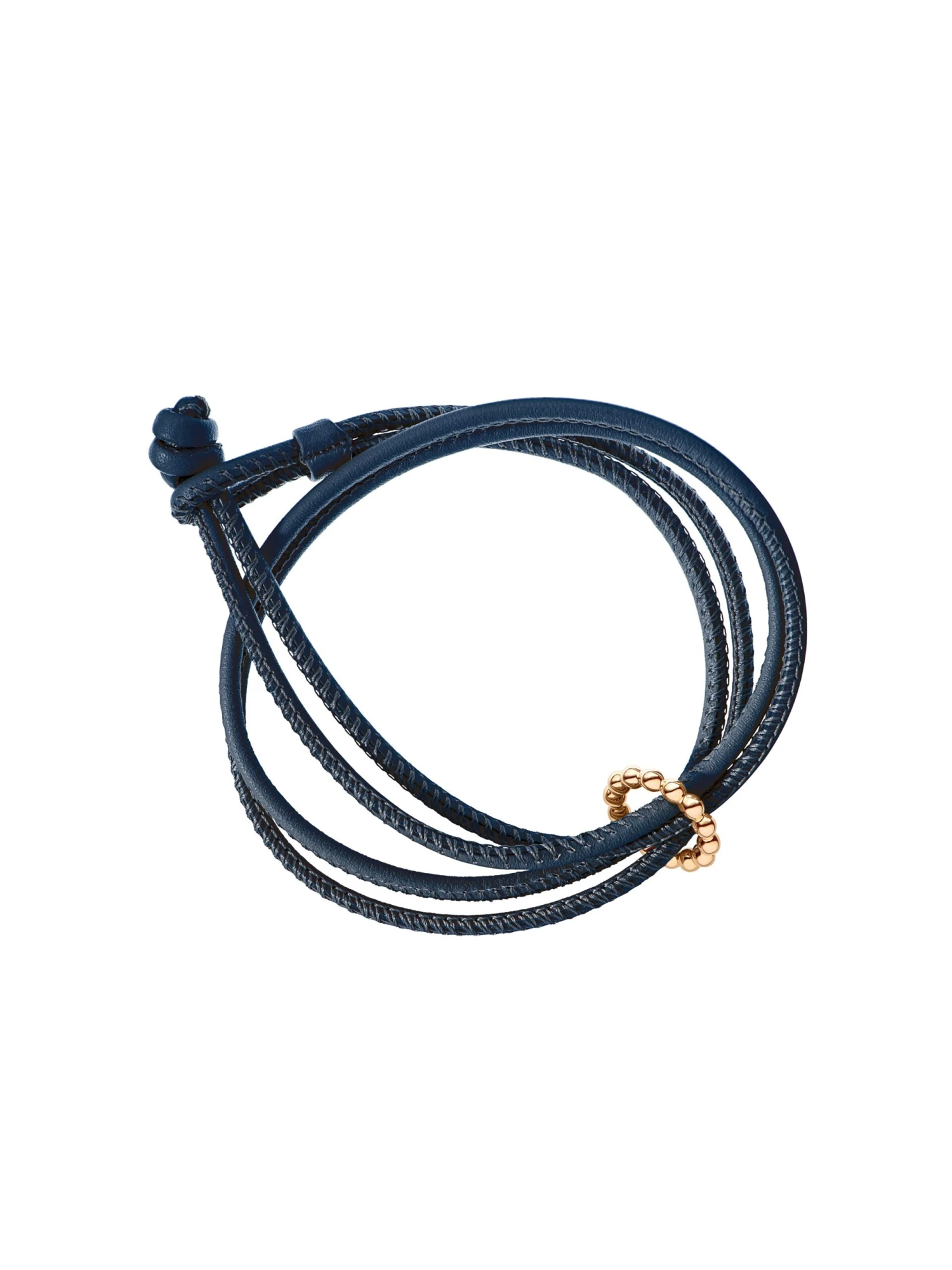 For an unconventional look: The Helioro XS and Blu XS BY KIM pendants can be easily strung on the two-strand Basics by Wempe Classics leather-cord bracelet made of soft calfskin. The uncomplicated knot lends the bracelet a cool touch. A confident companion for all those who like to wear their jewelry in a casual and relaxed way.