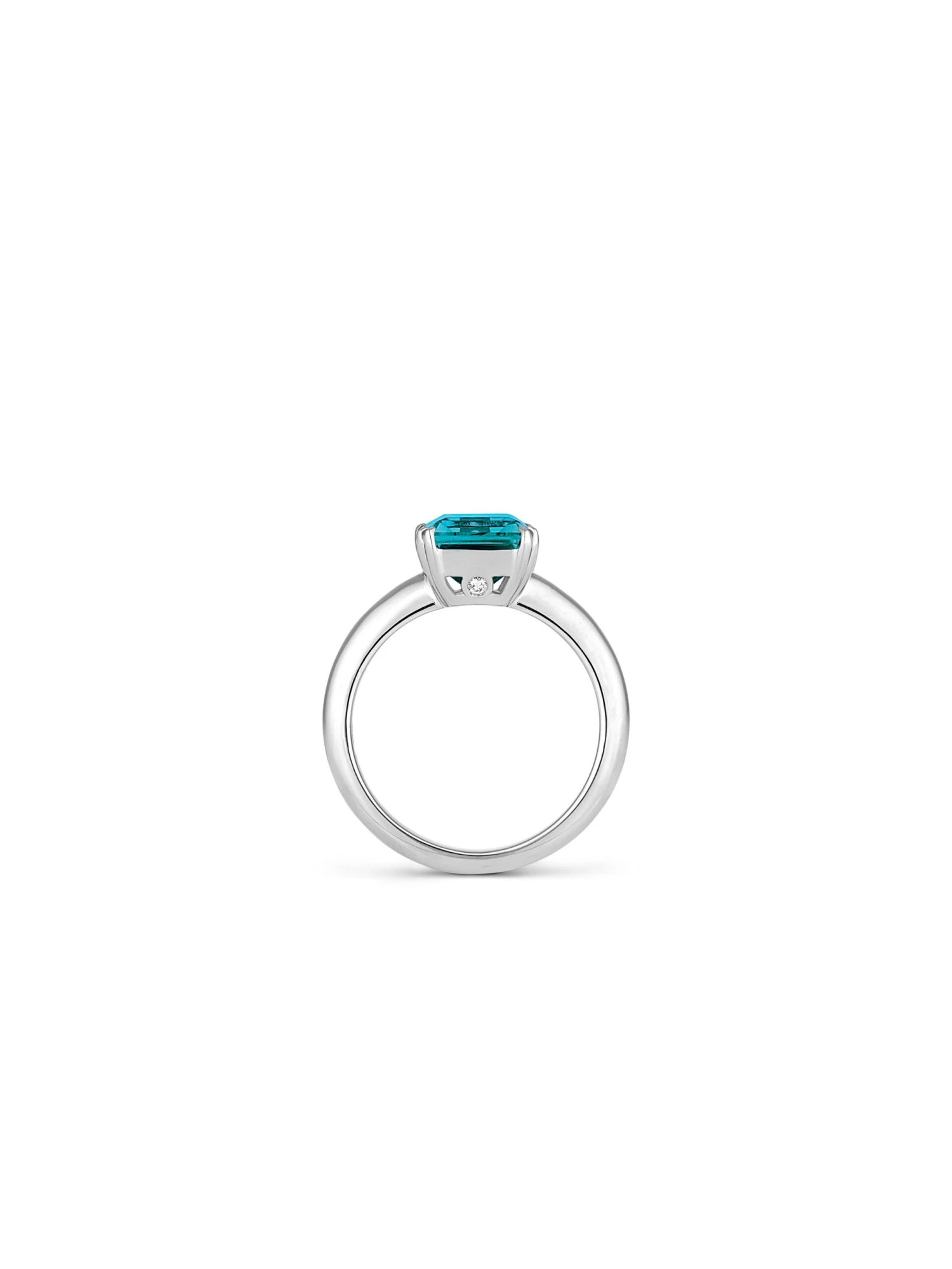 The center of this enchanting ring in 18k white gold is a London Blue topaz that is held by four double prongs. In addition to its impressive size, the colored gemstone attracts attention through its octagonal cut and its setting on a purist ring band. 2 small brilliant-cut diamonds of 0.02 ct on both sides are the proof that purism and love of detail donโt necessarily exclude each other. As a special feature, this ring is also available in other color versions so that every woman can choose her personal favorite and match it with her clothes.