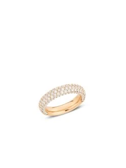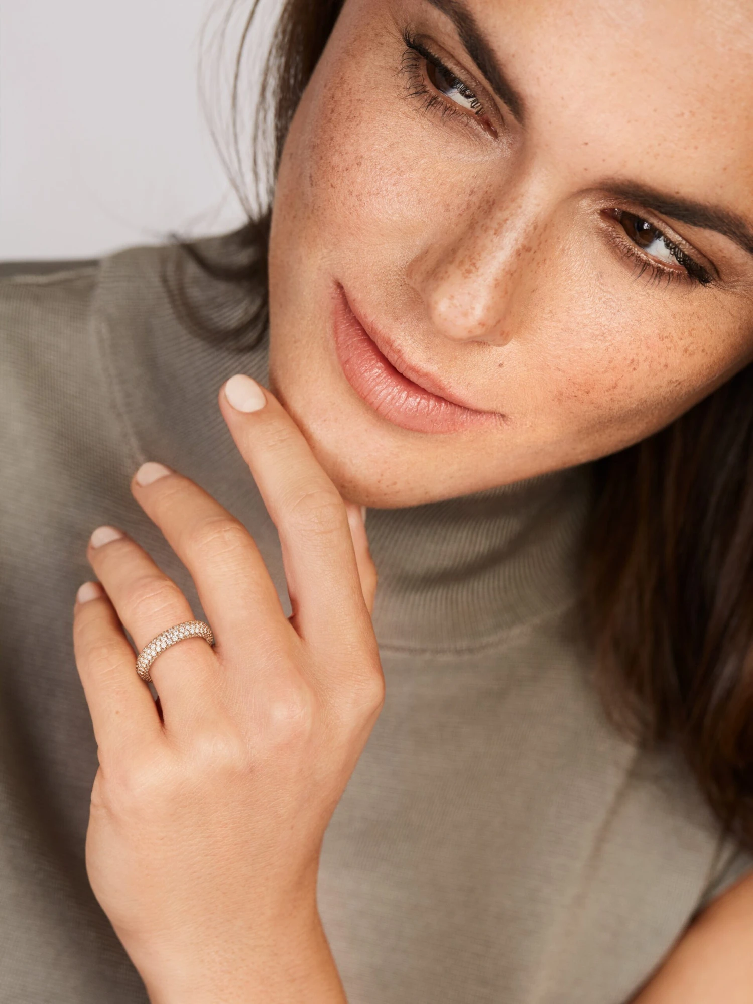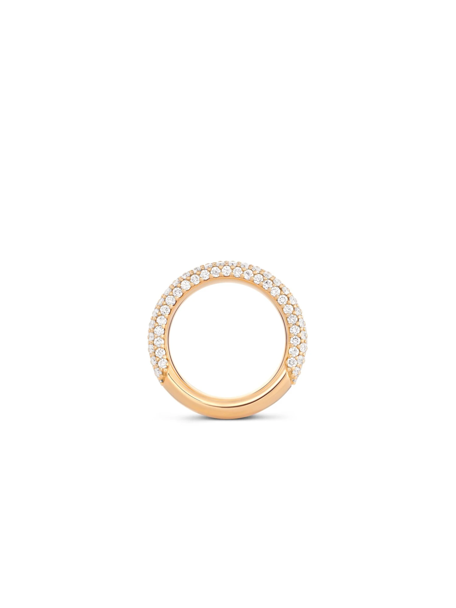 The interplay of diamonds and warm radiant rose gold is legendary. The Basics by Wempe Classics ring gives this dream team the perfect stage. 129 brilliant-cut diamonds totaling 2.09 ct are set in five rows in haloed prong settings on a broad ring band in 18k rose gold. The impressive pavé setting and extraordinary feel of the ring are perfectly suited for pairing with other band rings. A creation to wear, love and bequeath.