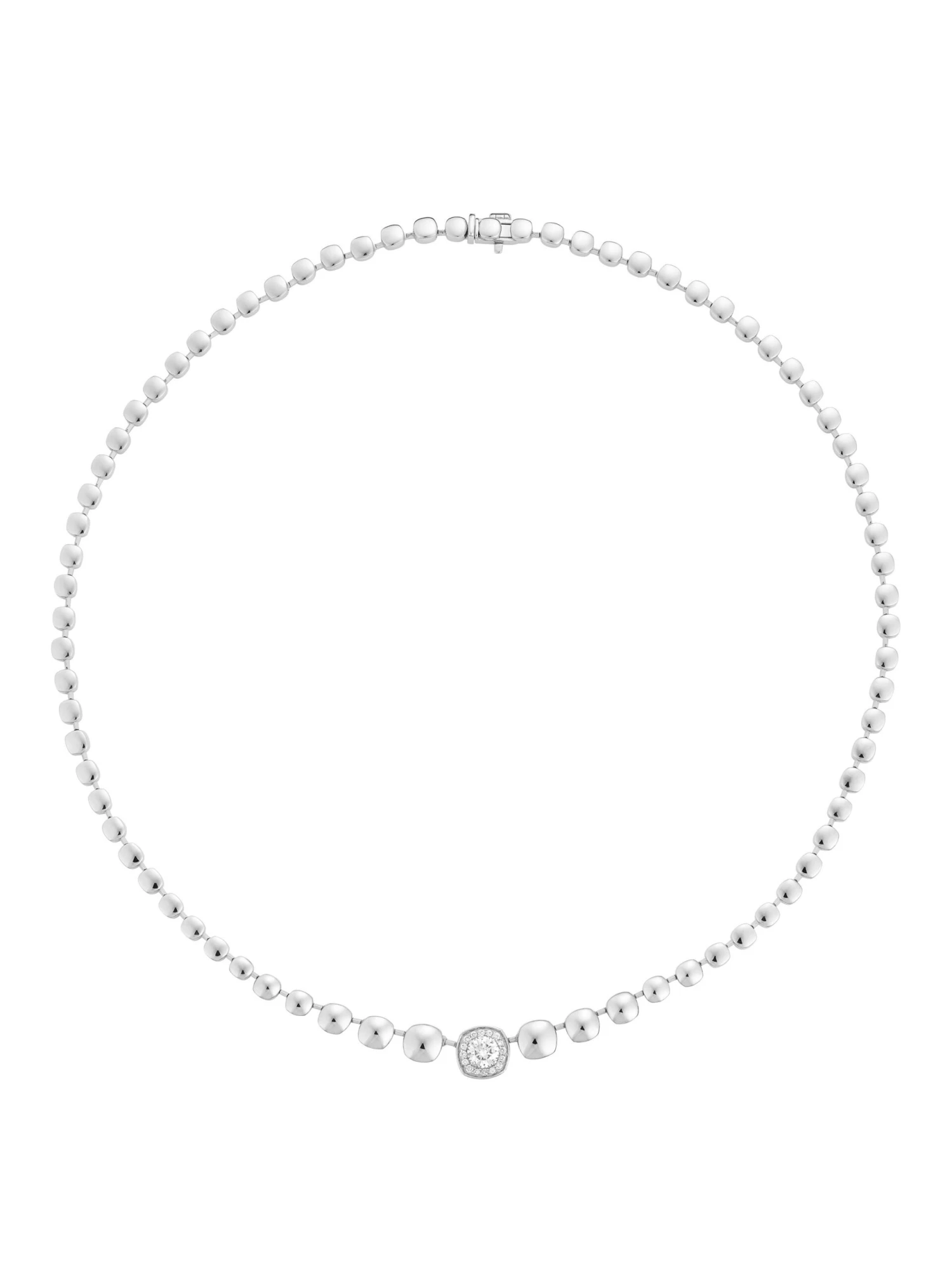 The pavé element with 17 brilliant-cut diamonds and a total carat weight of 0.51 ct clearly forms the center of the Blu Square BY KIM necklace. Furthermore, this piece of jewelry enthralls with its refined details. The slightly flattened cushion-shaped elements in 18k white gold perfectly adapt to the shape of the neckline and are beautifully arranged in graduated sizes. A piece of jewelery that forms a natural unity with its wearer.