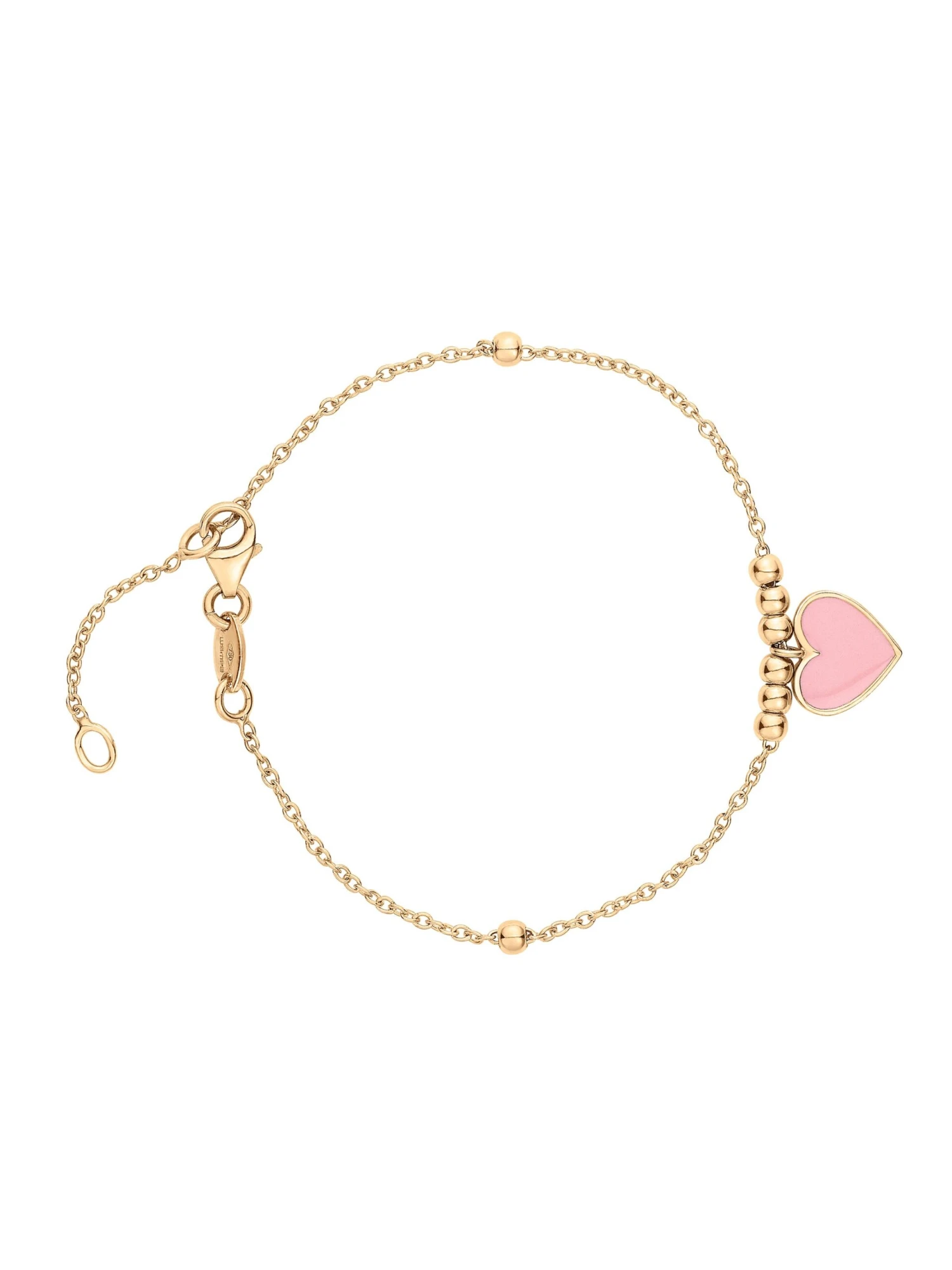 So cute: A delicate heart with pink lacquer forms the focal point of the bracelet. The fine cable chain of the Wempe Junior bracelet in 18k yellow gold is rhythmically interrupted by little beads that emphasize the playful charm of this piece of jewelry. A touching companion that pleases little and big girls alike.