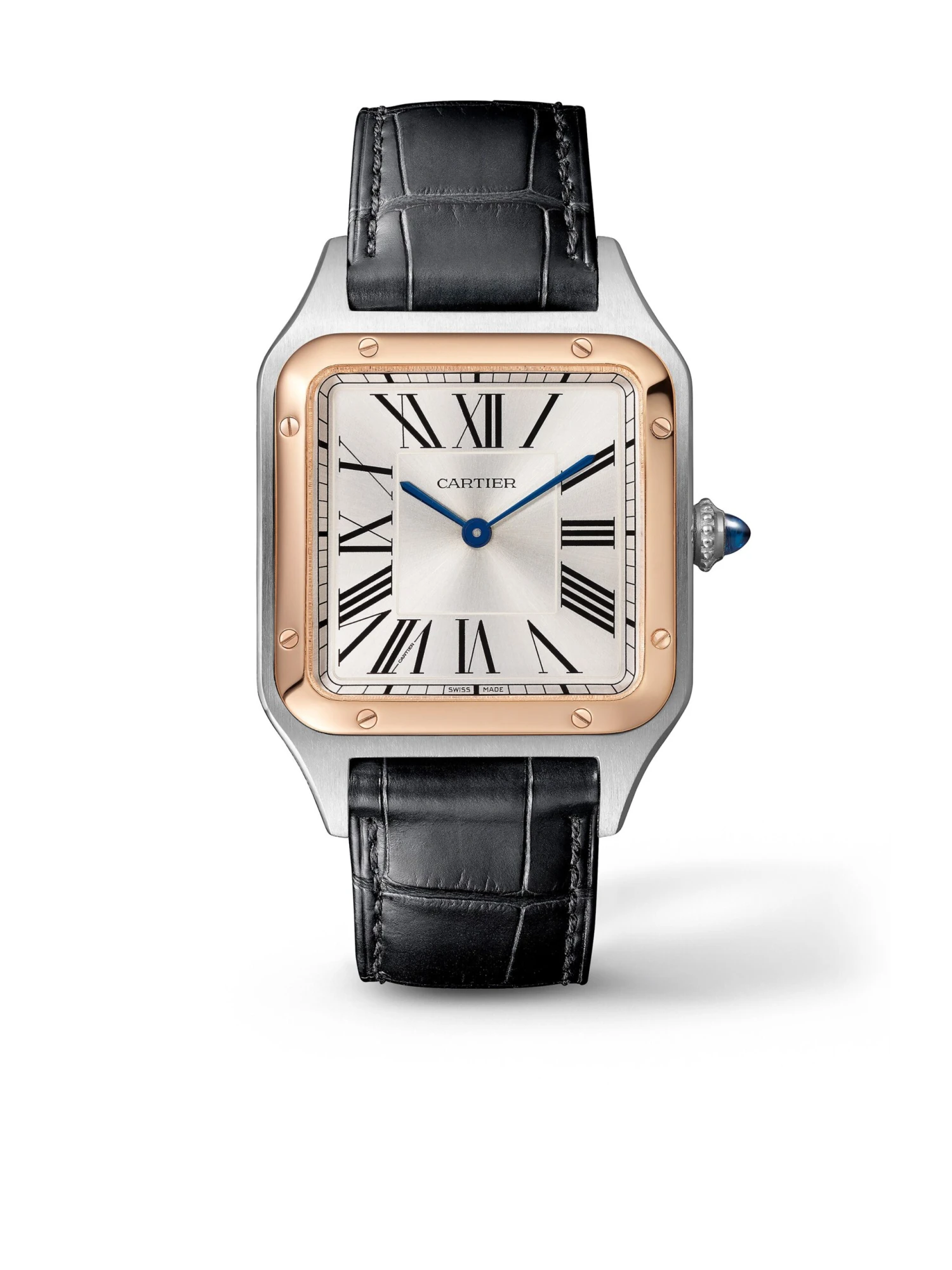 Santos-Dumont watch, large model, high autonomy quartz movement (~ 6 years). Steel case, 18K rose gold (750/1000) bezel, steel beaded crown set with a blue synthetic cabochon-shaped spinel, satin-brushed silver dial with sunray effect, Roman numerals, blued-steel sword-shaped hands, sapphire crystal. Strap in black alligator leather, with steel ardillon buckle. Case dimensions: 43.5 mm x 31.4 mm, thickness: 7.3 mm. Water-resistant up to 3 bar (approx. 30 meters/100 feet).