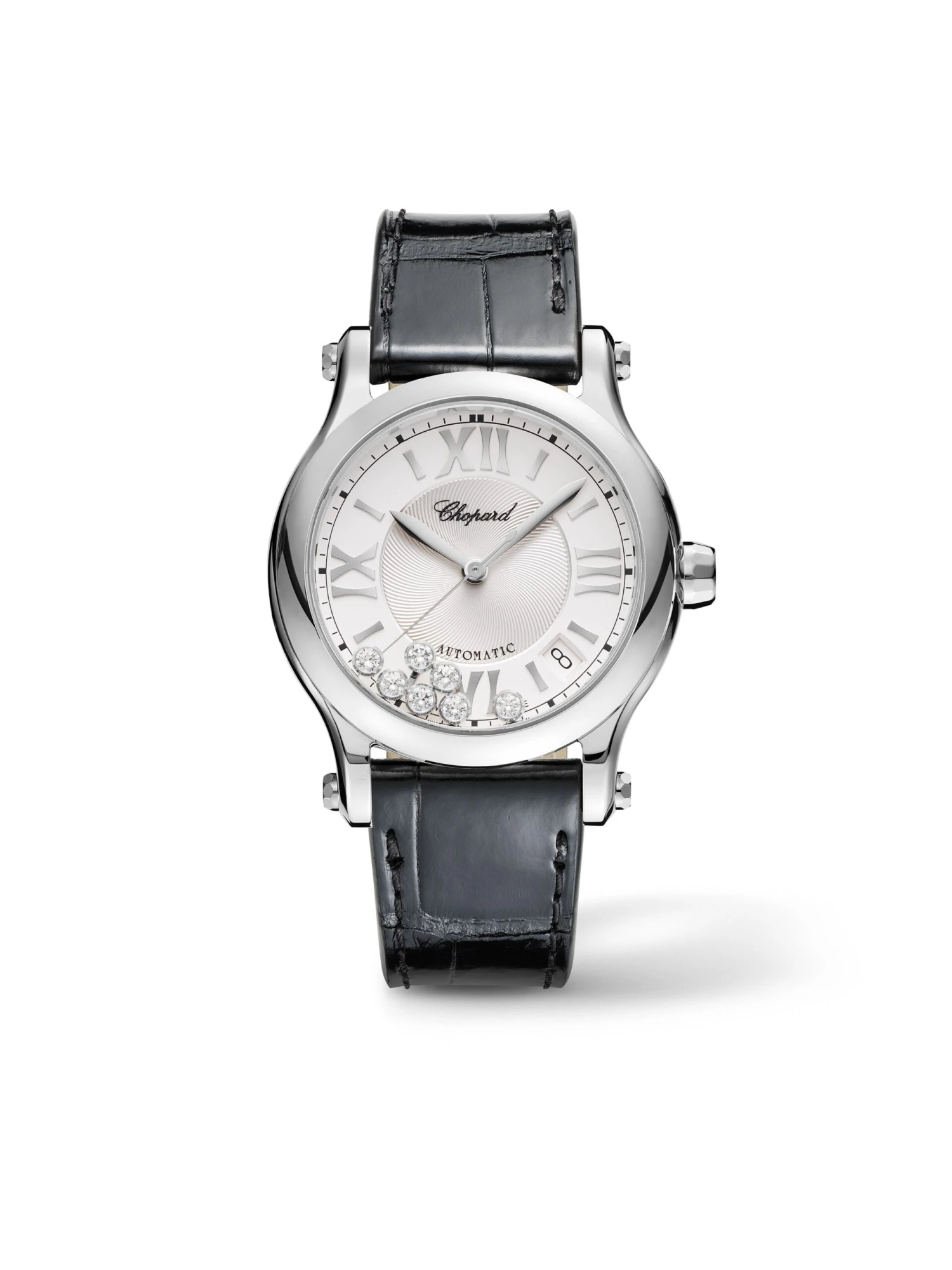 Stainless steel and diamonds, this is what made the Happy Sport famous. Here the seven movable diamonds glide over a silver-colored dial. The three-hand watch with Roman numerals and a diameter of 36 millimeters is driven by a mechanical automatic movement. This ladies watch is held together by a black alligator-skin strap.