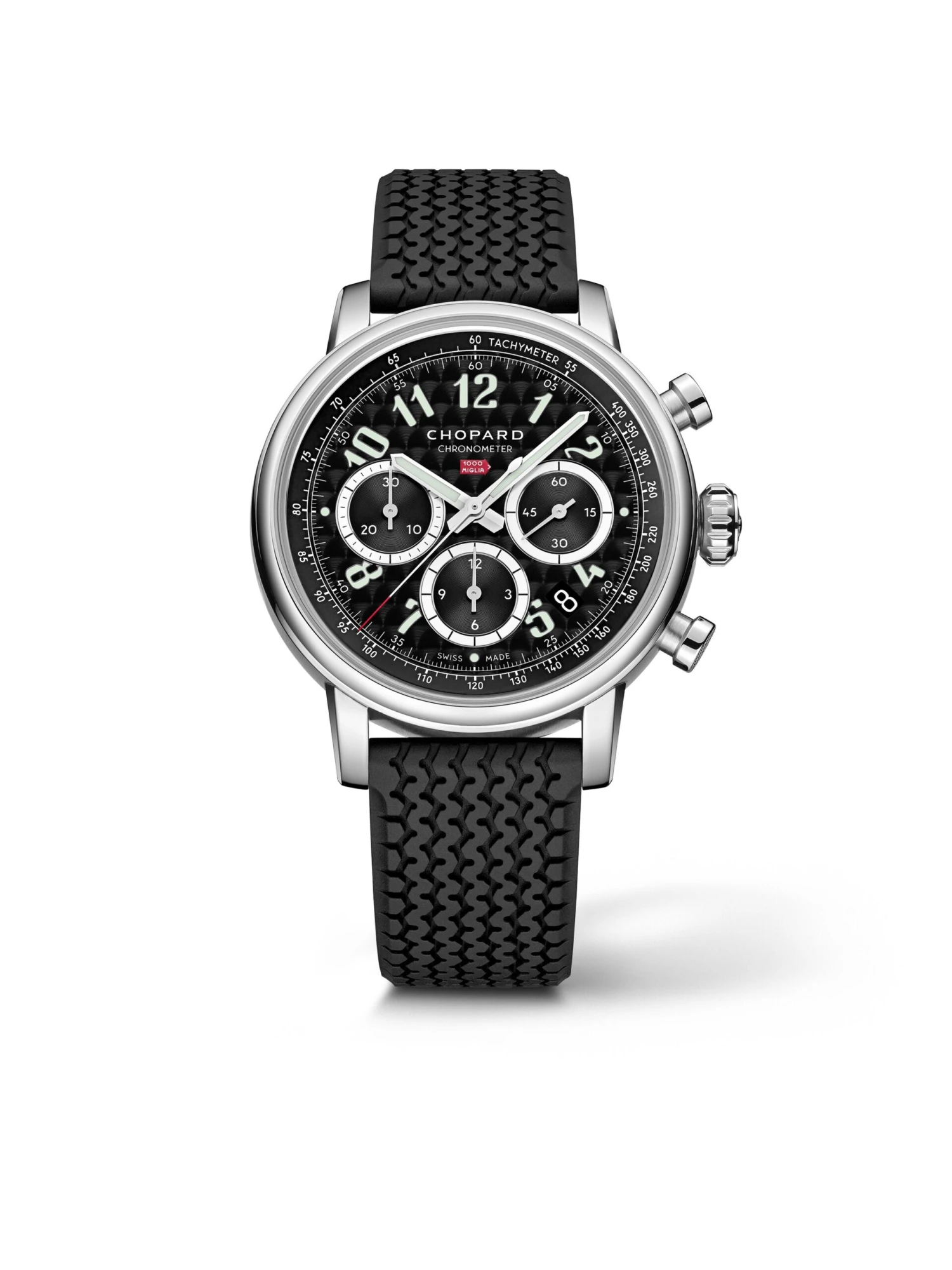The Mille Miglia Classic Chronograph (Ref. 168619-3001) is inspired by the prestigious 1000 Miglia race for classic cars. So it’s no wonder that the 40.5-millimeter stainless-steel case beautifully combines sporty design and retro accents. Silver hands in the two counters for twelve hours and 30 minutes and the small seconds subdial as well as the date display are reminiscent of the racing cars of the world’s most beautiful car race, while the electroplated dial in the color “Nero Corsa” corresponds to a popular lacquer color code. The watch is powered by a chronometer-certified self-winding mechanical chronograph movement, which can be seen through a sapphire crystal caseback. A black rubber strap with tire tread pattern completes the distinctive look.