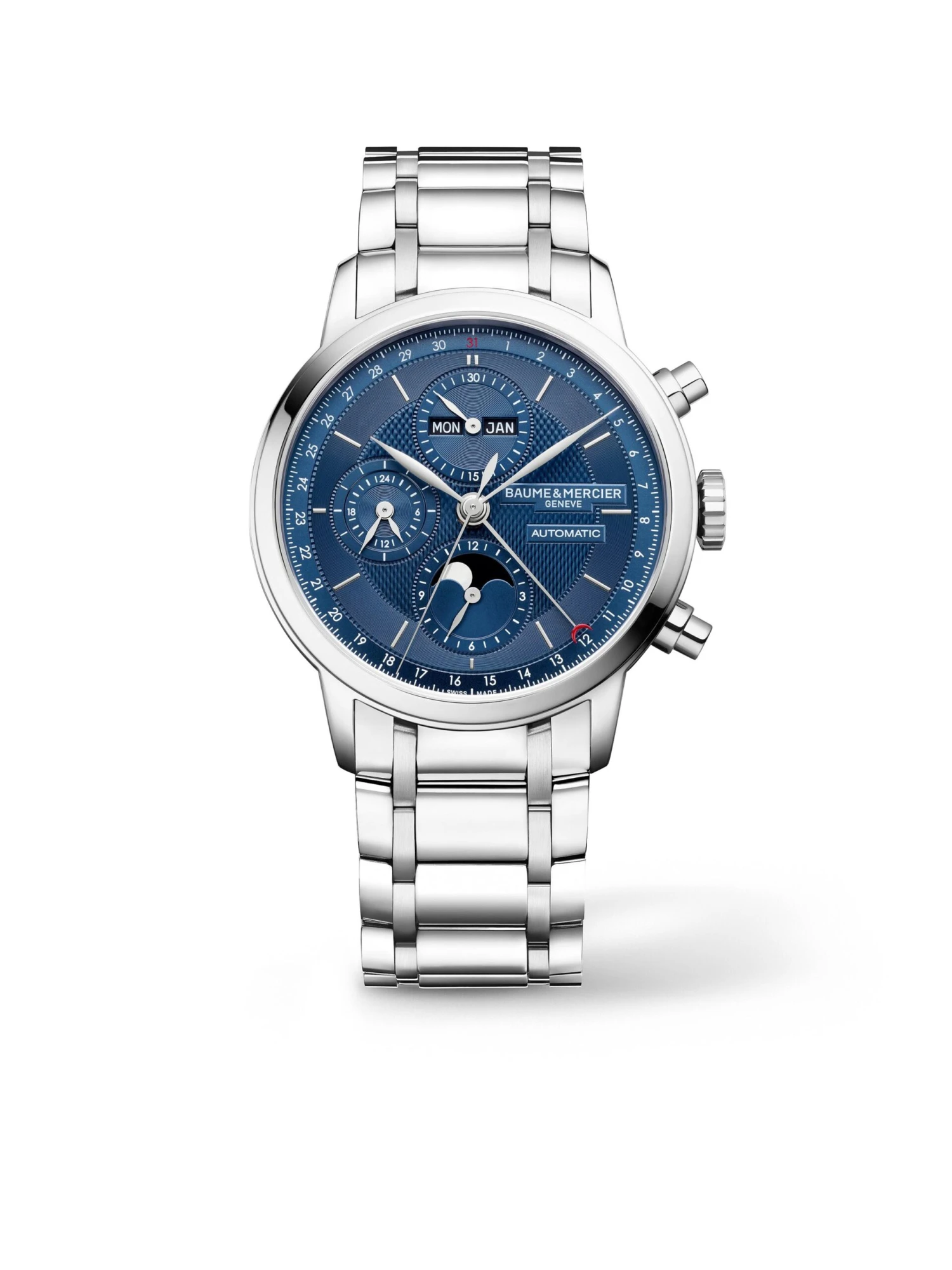 The age-old expertise of the Geneva manufactory is exquisitely reflected in this automatic chronograph with moon phase display and annual calendar. Despite the diversity of the displays, the dial, with its artistic guilloche accents, remains clear and easy to read. The Classima Ref. 10485 beats to the rhythm of caliber Valjoux 7751, which is revealed through the sapphire crystal case back of the 42.0 x 13.25 mm stainless steel case. The masculine elegance of the timepiece is rounded off by a stainless steel strap.