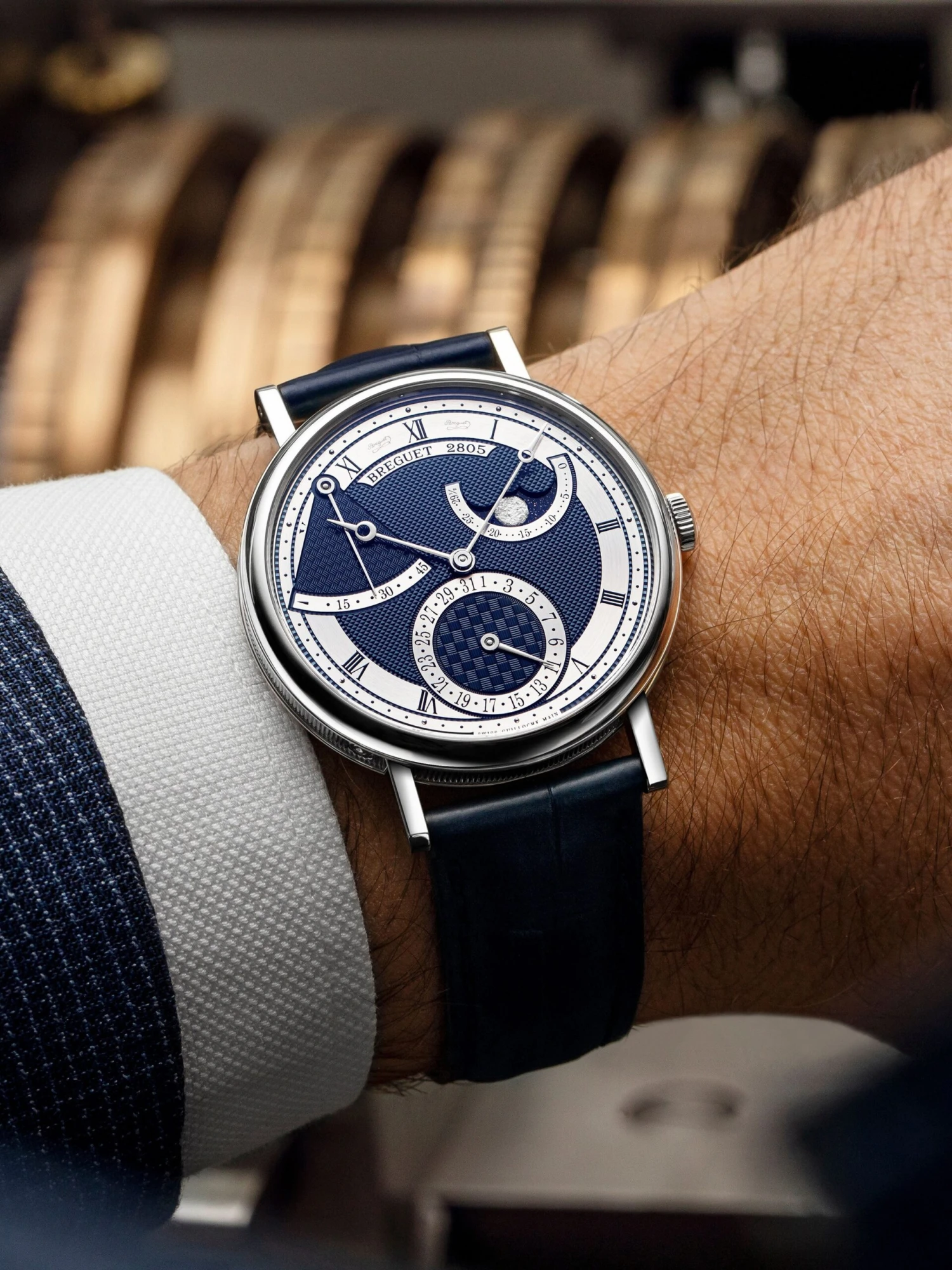 The elegant timepieces in the Breguet Classique line are all about precision and perfect readability of the indications. They are stylistically inspired by the brand’s founder and feature a wealth of fascinating technical and aesthetic details. The blue, hand-guilloched dial of the Classique 7137BB features a detailed moon-phase display between 1 and 3 o’clock, a power reserve of 45 hours between 9 and 11 o’clock, and a date indicator as an extra dial between 5 and 7 o’clock. The design of the dial with its filigree Breguet hands is no less impressive than the automatic movement, caliber 502.3 DR1 in an 18k white gold case measuring 39 millimeters in diameter and 8.65 millimeters in height, and the silicon hairspring that ensures maximum precision. The blue alligator-skin strap elegantly rounds off the elegant design of this aficionado watch.