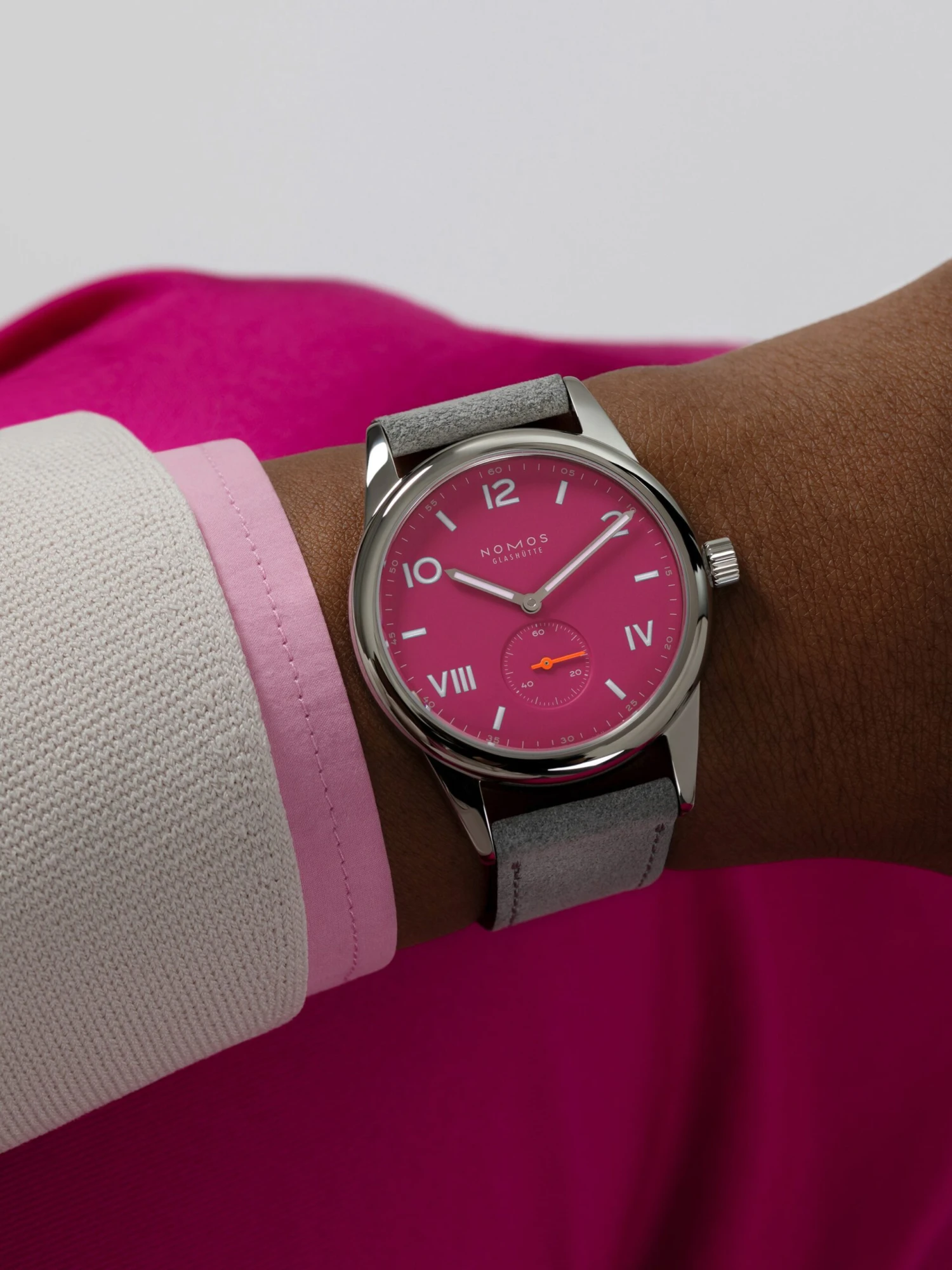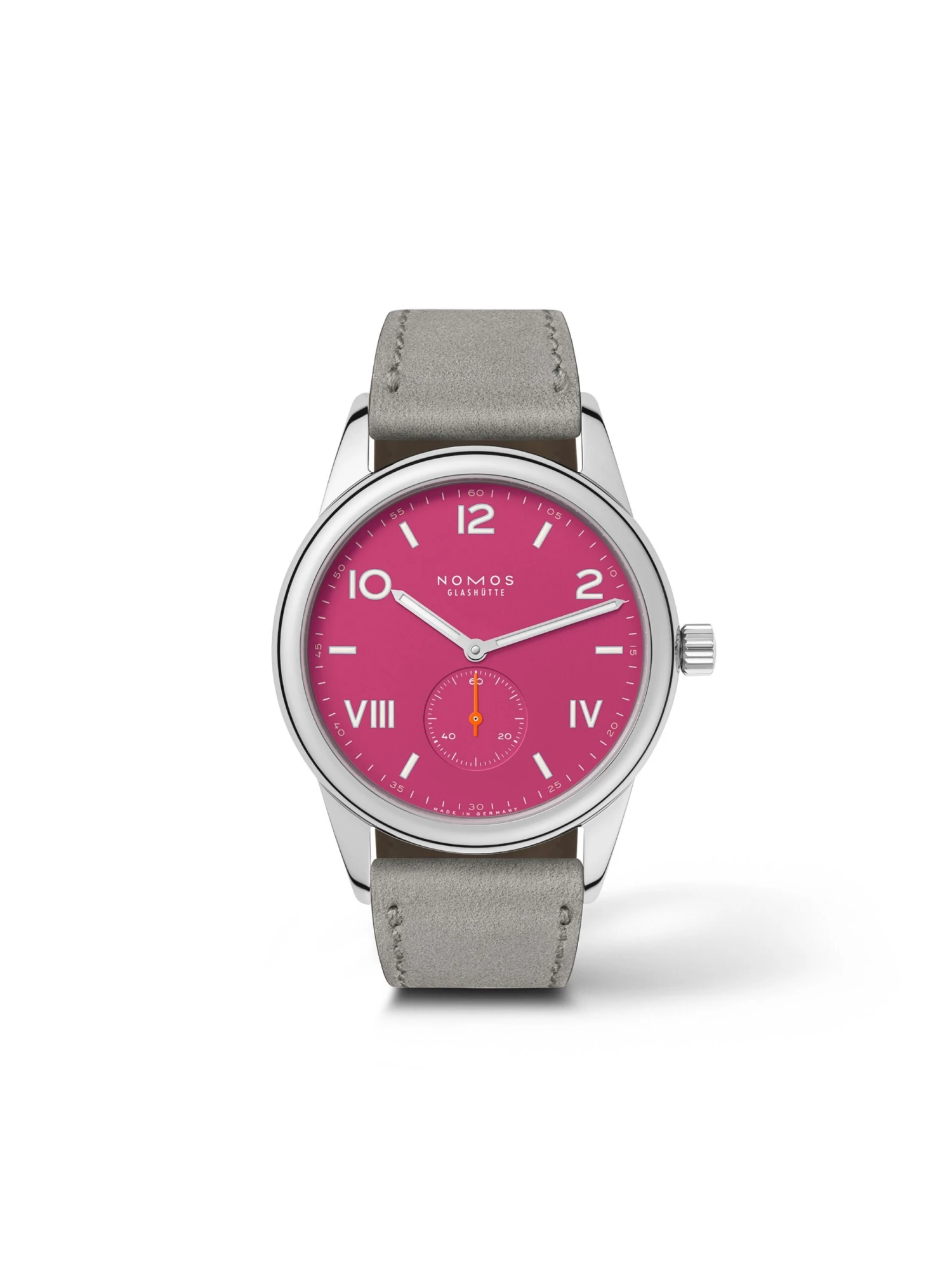 The Club is an entry-level model from Nomos Glashütte designed to speak to more of a younger clientele. Its special trademark is the mix of Arabic and Roman numerals, which achieve a standout effect on the pink background of the Club Campus Deep Pink Ref. 728 in both good and bad lighting thanks to their white color and Superluminova coatings. The stainless-steel case, 38 x 8.2 millimeters large, is water-resistant up to 100 meters and comes with the proprietary manufacture caliber Alpha with stop-seconds function. The Club Campus Deep Pink is worn on a gray suede strap.