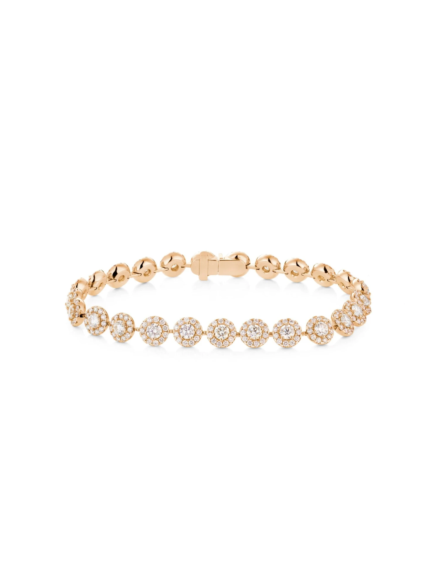 An impressive work of art, created with high-precision craftsmanship. The Crown BY KIM bracelet in 18k rose gold boasts 25 elaborate elements made of 300 brilliant-cut diamonds with a total carat weight of 6.75 ct. The diamond-set setting baskets are arranged like small flowers with a larger diamond as their radiant focal point. This sensational tennis bracelet is securely worn on the wrist thanks to a box clasp with a safety catch, adding a glamorous sparkle to your evening outfit.