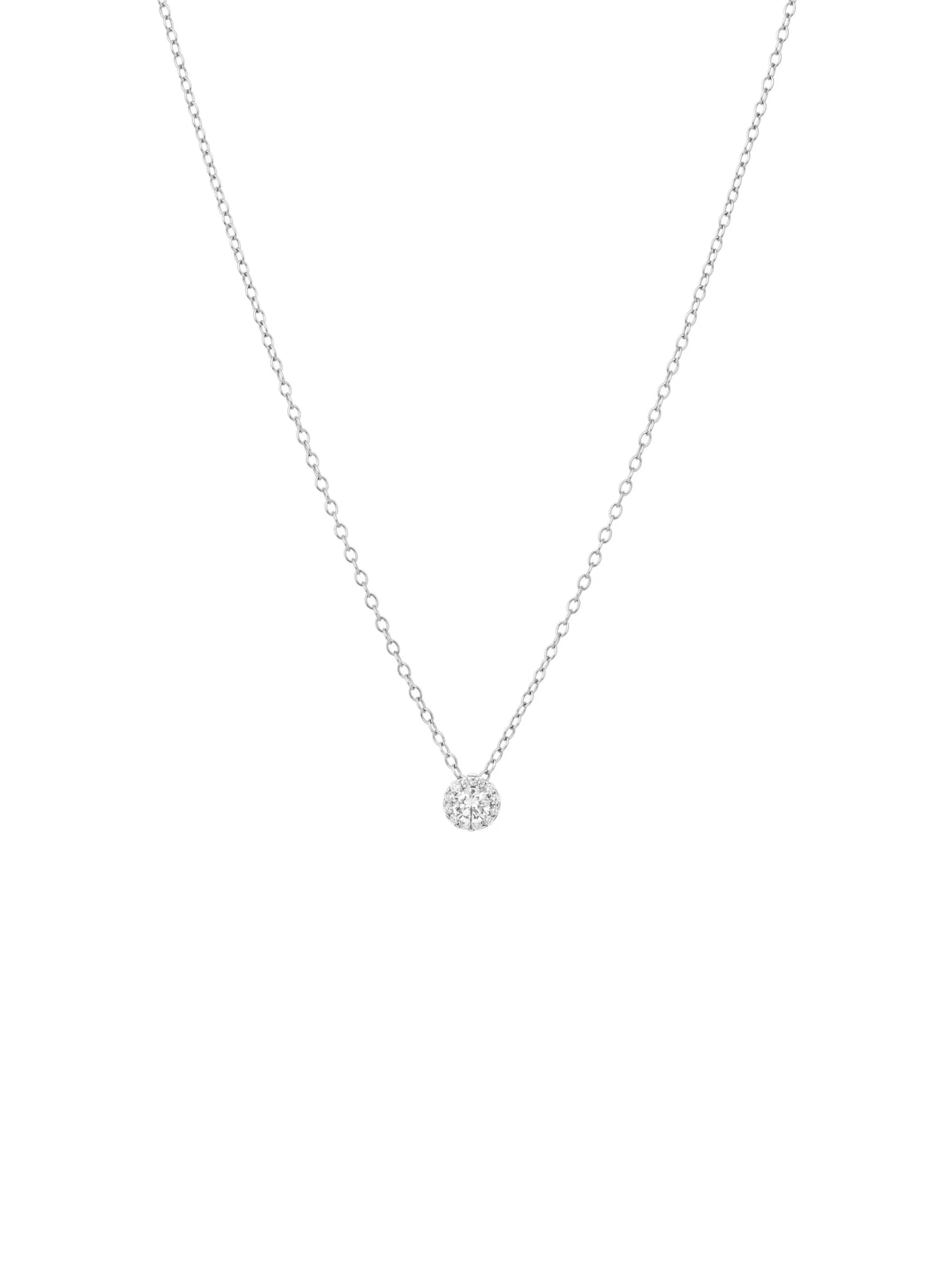 Sparkling radiance and timeless elegance lend this 18k white gold Crown BY KIM solitaire pendant its uniqueness. The centerpiece of this pendant is a 0.50 ct diamond. Held weightlessly and virtually invisible, it seems to float above a sparkling hoop of 12 brilliant-cut diamonds. A noble classic that can be paired with a smart blouse as well as a festive evening dress.