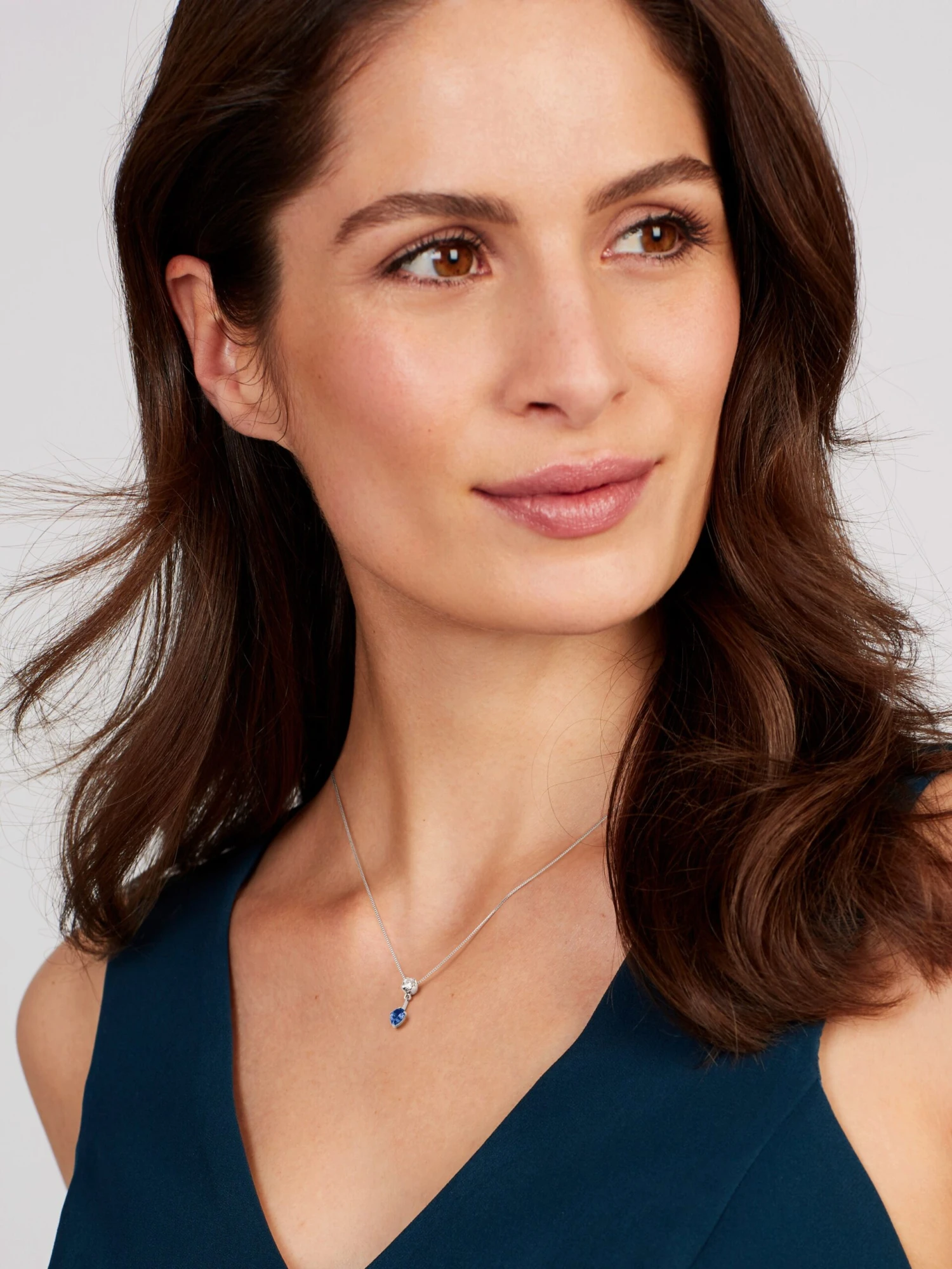 The timeless design vocabulary of the Daily Colors BY KIM pendant on a single-strand necklace in 18k white gold is underscored by the dark blue color of the pear-shaped iolite of 0.30 ct and calls to mind the clarity and discreet elegance of the Hanseatic City of Hamburg. The colored gemstone and the delicate brilliant-cut diamond of 0.13 ct reflect the facets of water and provide a touch of color to every look without being too dominating.