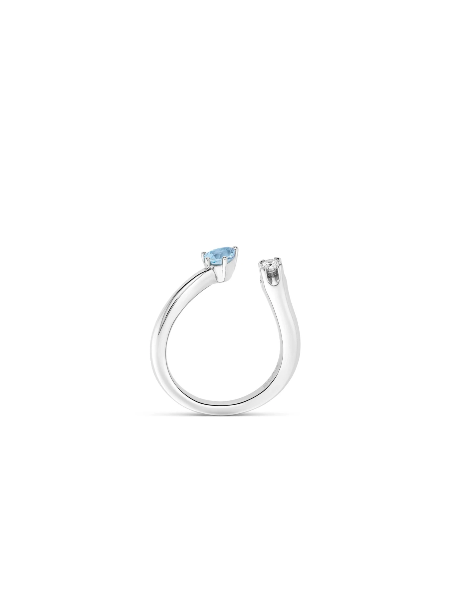 The tender interplay of 18k white gold and the fascinating light blue color of the pear-shaped aquamarine of 0.35 ct of this open Daily Colors BY KIM ring calls to mind the Hanseatic City of Hamburg – a city of discreet elegance and clarity. The colored gemstone and the delicate brilliant-cut diamond of 0.14 ct reflect the facets of water and add that certain something to this ring that make it a favorite item for every day.