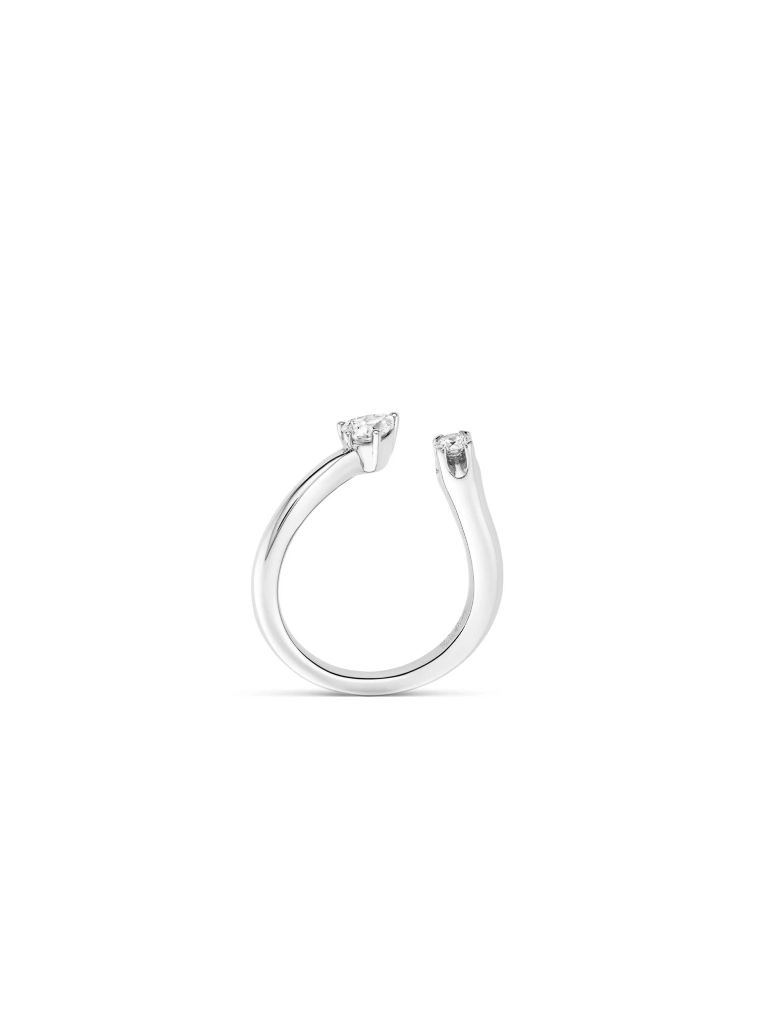 A classic of a special style: A minimalistic design vocabulary, curved lines as well as a sophisticated interplay of a pear-shaped diamond of 0.30 ct and a delicate brilliant-cut diamond of 1.14 ct. turn the open Daily Diamonds BY KIM ring in 18 karat white gold into a wonderful eye-catcher of timeless beauty. It is perfectly suited for women who constantly reinvent themselves and are looking for a favorite jewelry item for every day.