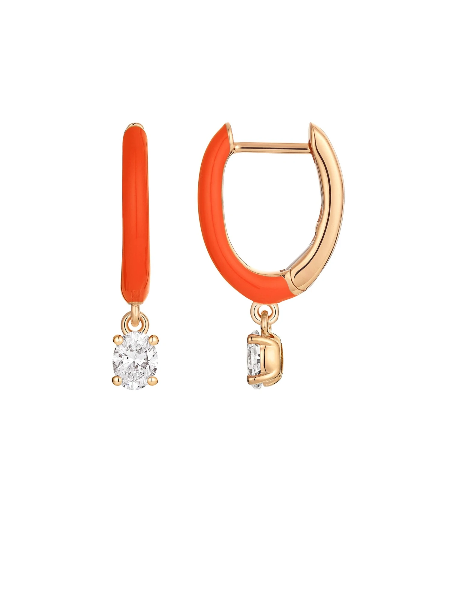 Add a dash of color! The Electrify by Wempe Casuals earrings venture a refreshing mix of diamond jewelry and modern design. Half of the 18k rose gold hoop earrings features an orange enamel application that draws the eye to the two oval-cut diamond pendants totaling 0.40 ct. The special combination adds an exciting color accent to any outfit and instantly lifts your spirits.