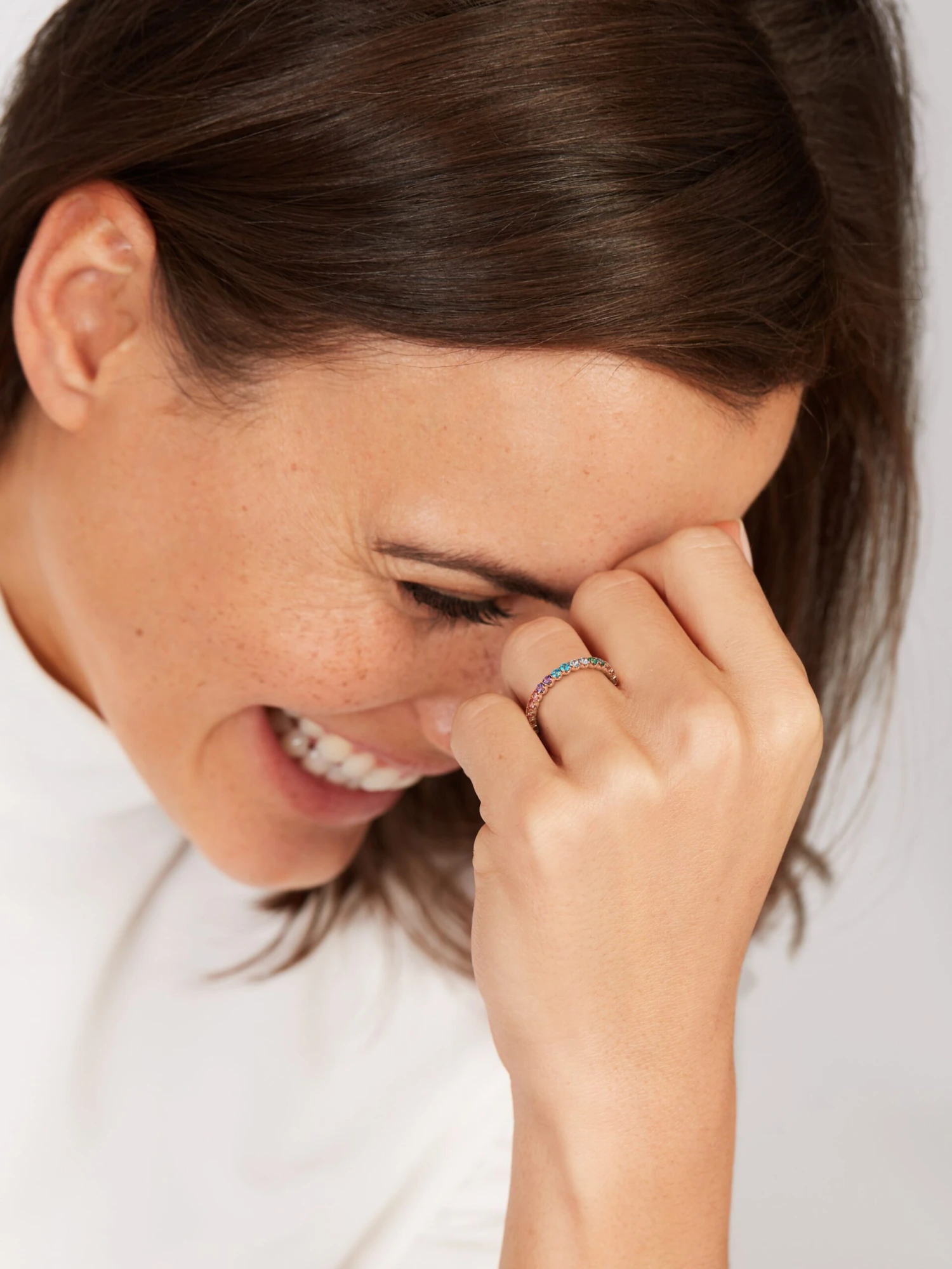 “There is a pot of gold at the end of the rainbow”. With the Electrify ring, our treasure hunt will come to an end: presenting itself in all colors of the rainbow, this ring inspires us with its lightness and takes us back to our childhood. 29 topazes, set in warm 18k rose gold, let us dream and give sparkle to our summer outfits.