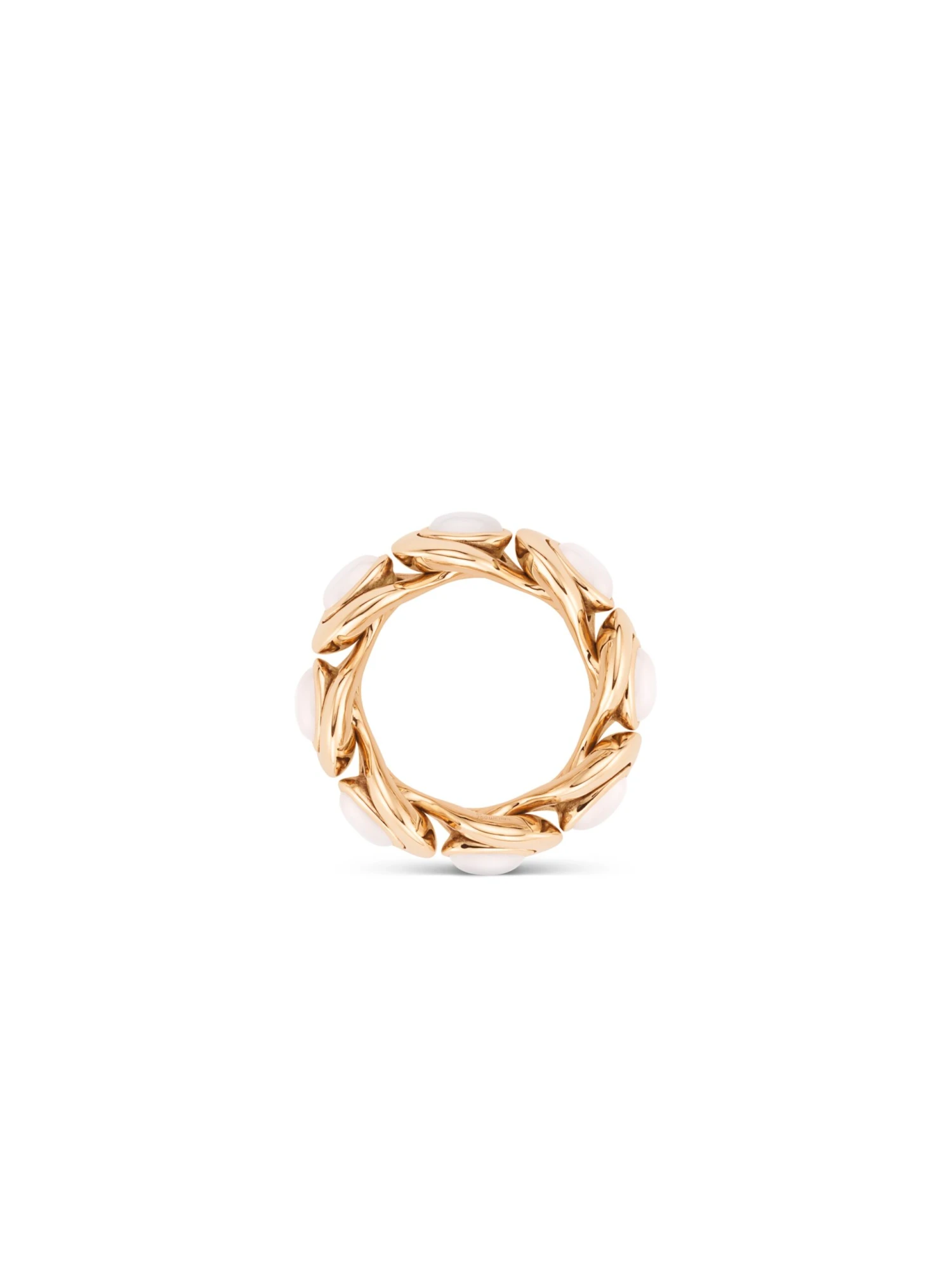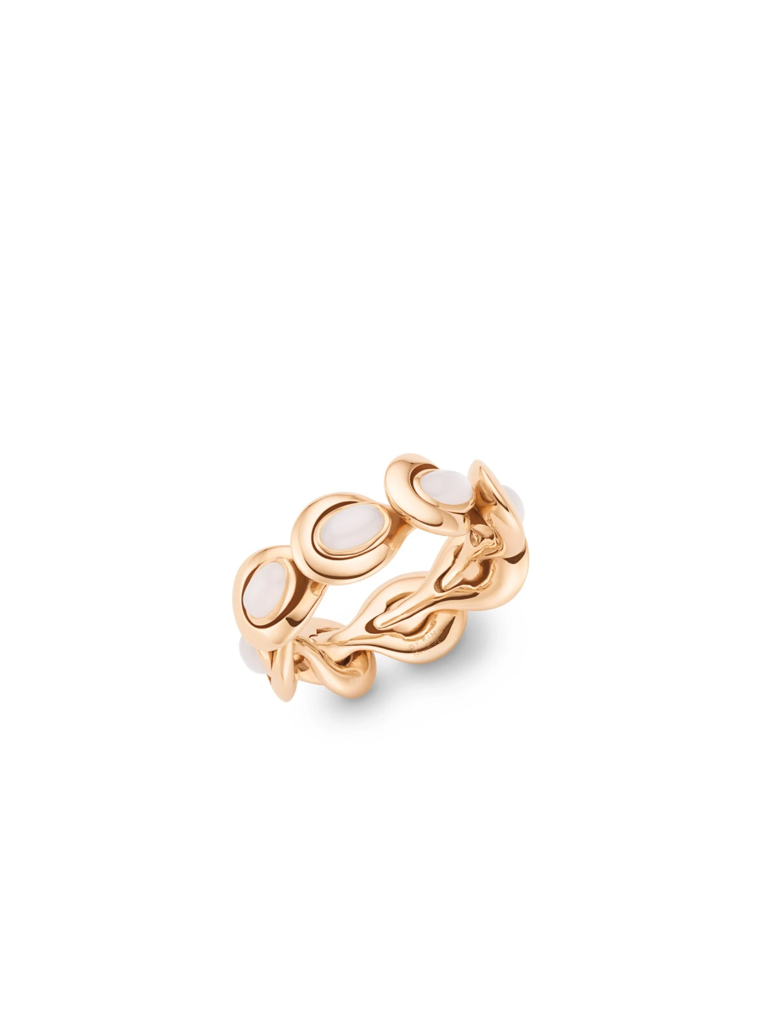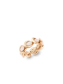 As a result of a masterful interplay of design and craftsmanship, the items of the Feel Me BY KIM line offer a sensational degree of wearing comfort. The trick: The individual elements are flexibly connected with each other so that they perfectly adapt their shape and create a wonderful tactile experience on the wearer’s skin. Moreover, the Feel Me BY KIM ring in 18k rose gold impresses by its highly polished surface, the mystical shimmer of eight cabochon-cut moonstones, and its seemingly organic shape. A ring in motion that moves you and caresses your skin.