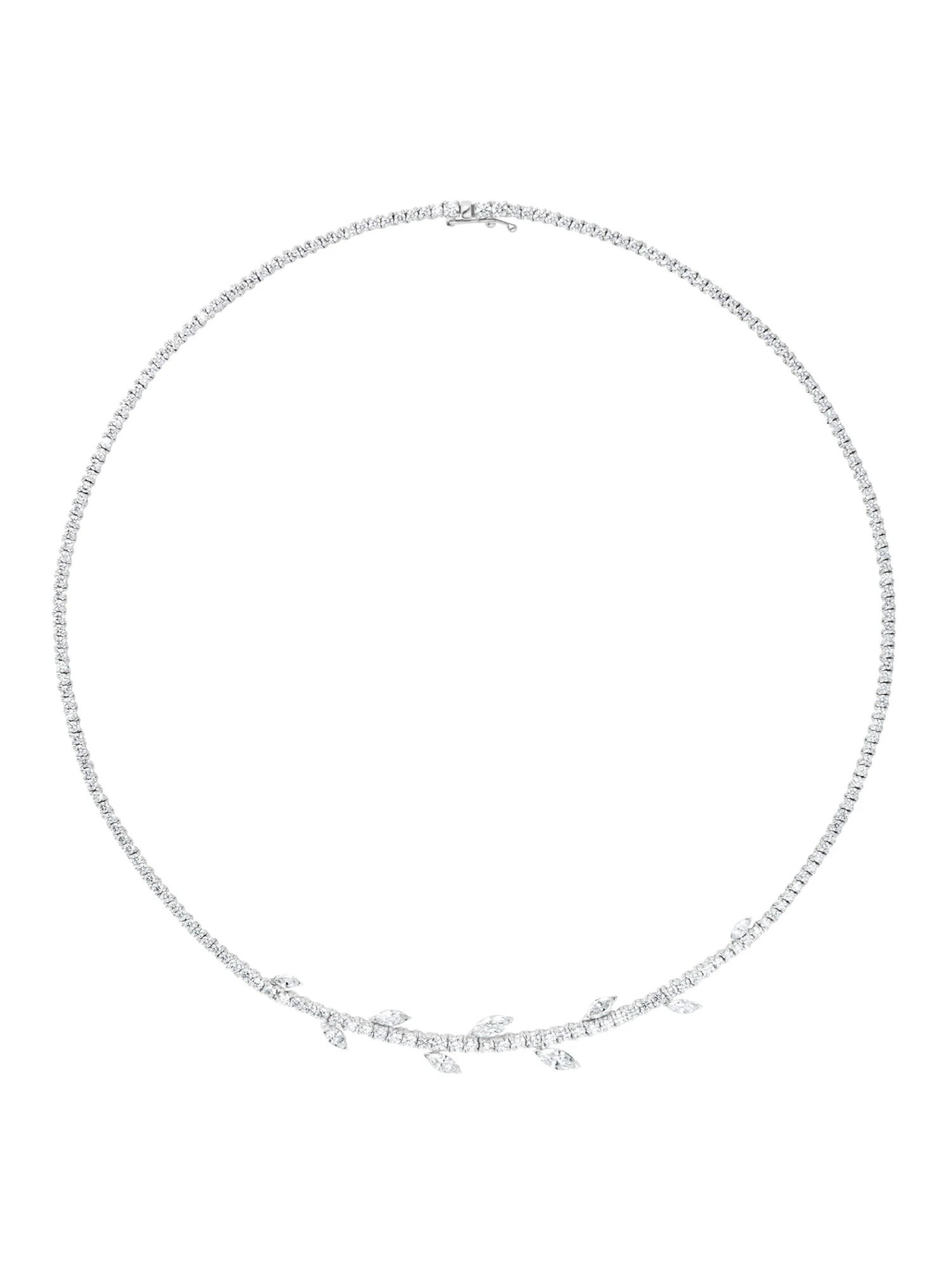 Like buds on a branch, nine small marquise-cut diamonds 1.60 ct in total flank this sparkling 18k white gold necklace. They provide this Rivière necklace with 202 brilliant-cut diamonds 5.80 ct with an alternating and particularly decorative frame. A necklace of unique beauty and an individual favorite that is made for special occasions.