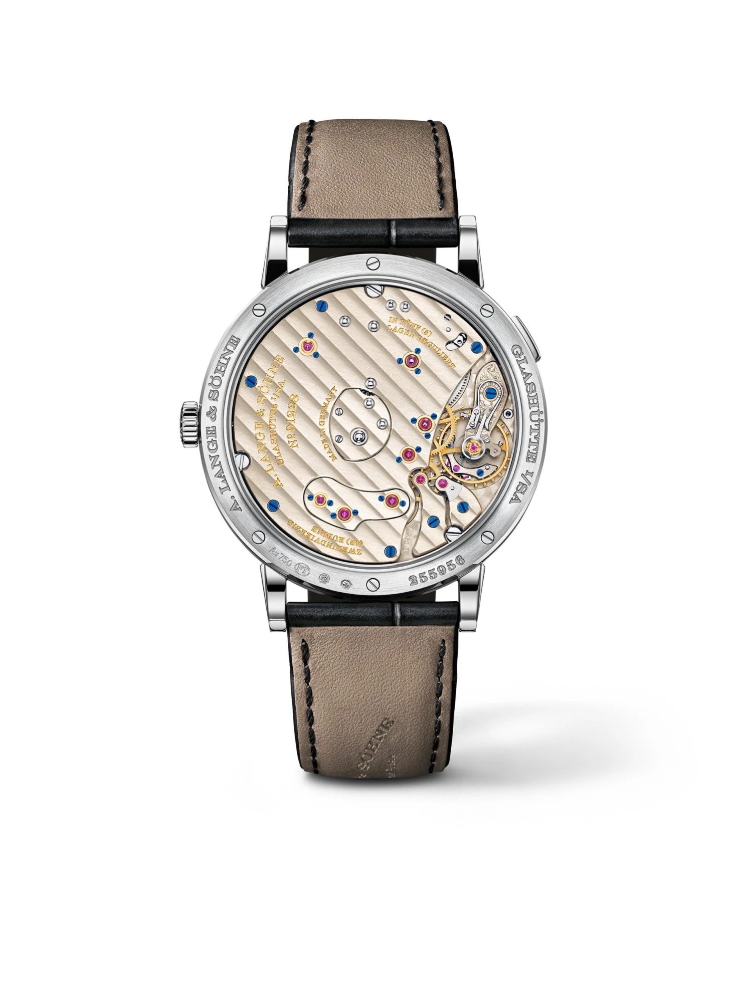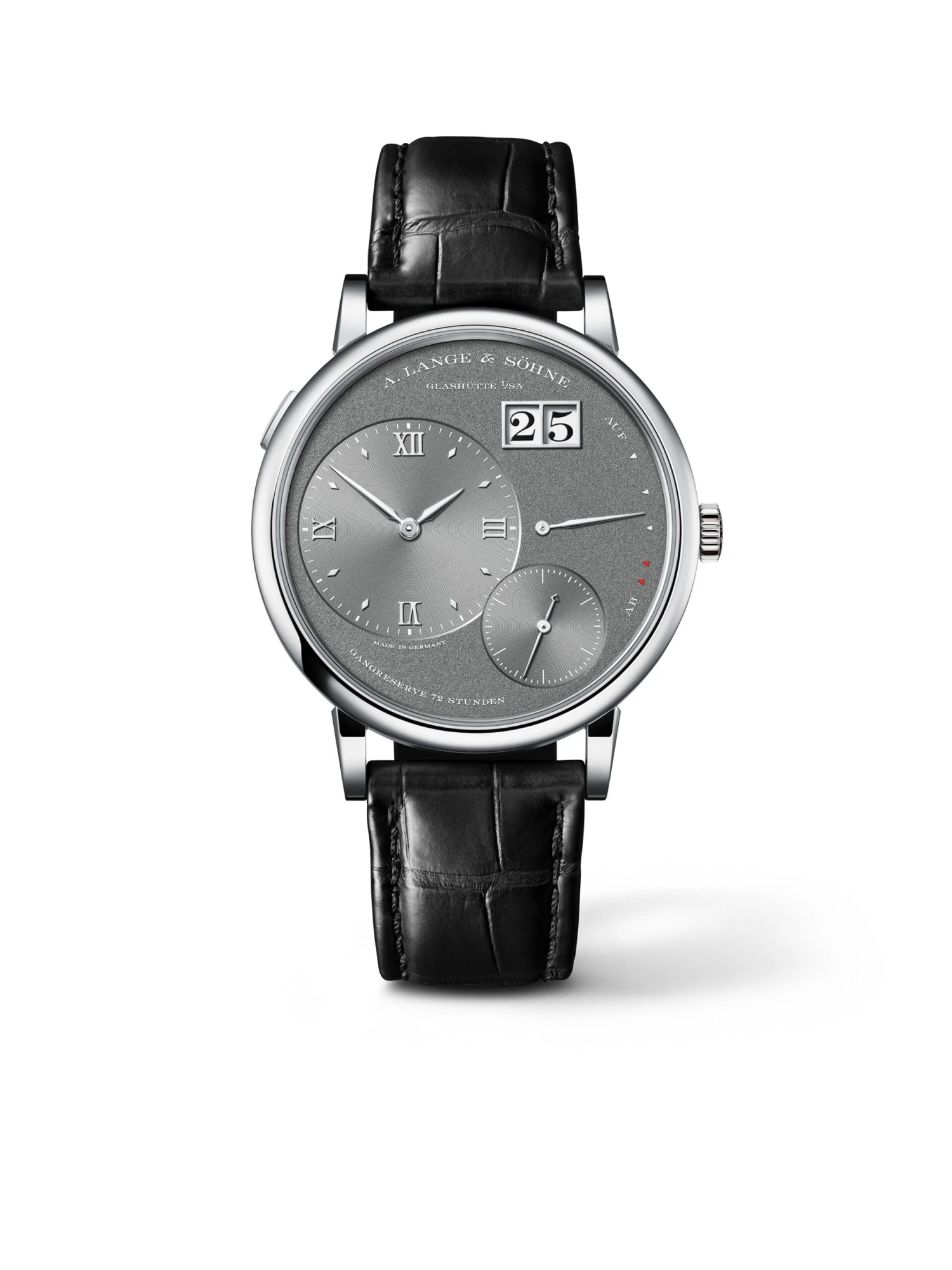 The classic from the house of A. Lange & Söhne, the Grand Lange 1 Ref. 137.038, presents itself after a subtle revision in the color combination of gray and white gold. The 18k white gold case has a diameter of 41 millimeters and fits snugly around the wrist with a height of just 8.2 millimeters. The characteristic, off-center displays on the gray dial made of solid silver are the eye-catchers in the collection. The filigree hands and Roman numerals are also made of white gold and, together with the case, create a very elegant appearance. In addition to the time, the Grand Lange 1 also features a small seconds subdial with stop-seconds function, a power-reserve display, and the typical Lange large date. The sapphire crystal caseback provides an unimpeded view of the hand-wound movement in which an escapement regulates the rate, the balance spring of which is manufactured in-house. The used Lange manufacture caliber L095.1 has a power reserve of 72 hours when fully wound. The fine timepiece is fitted on a black leather strap with an 18k white gold pin clasp.