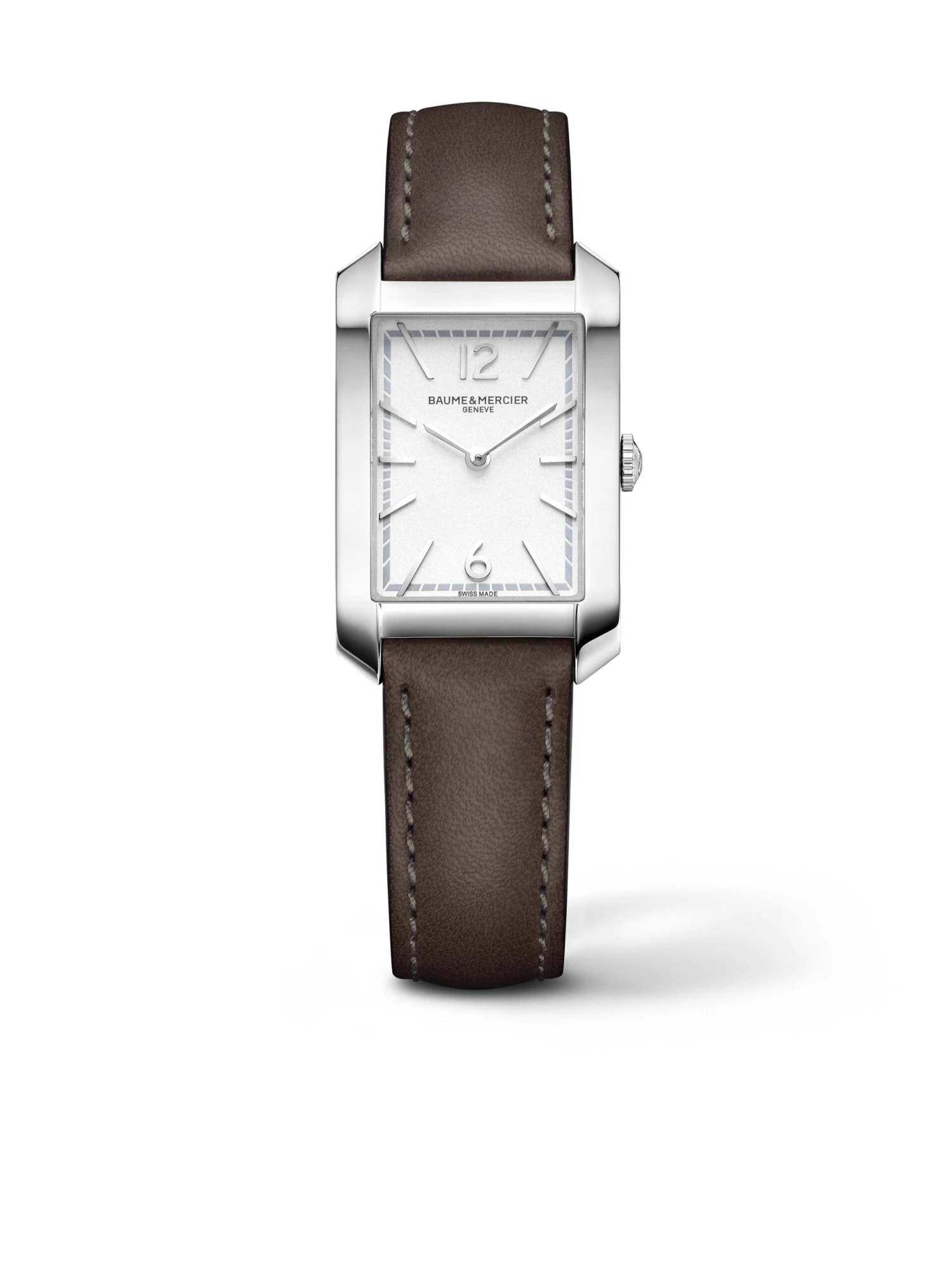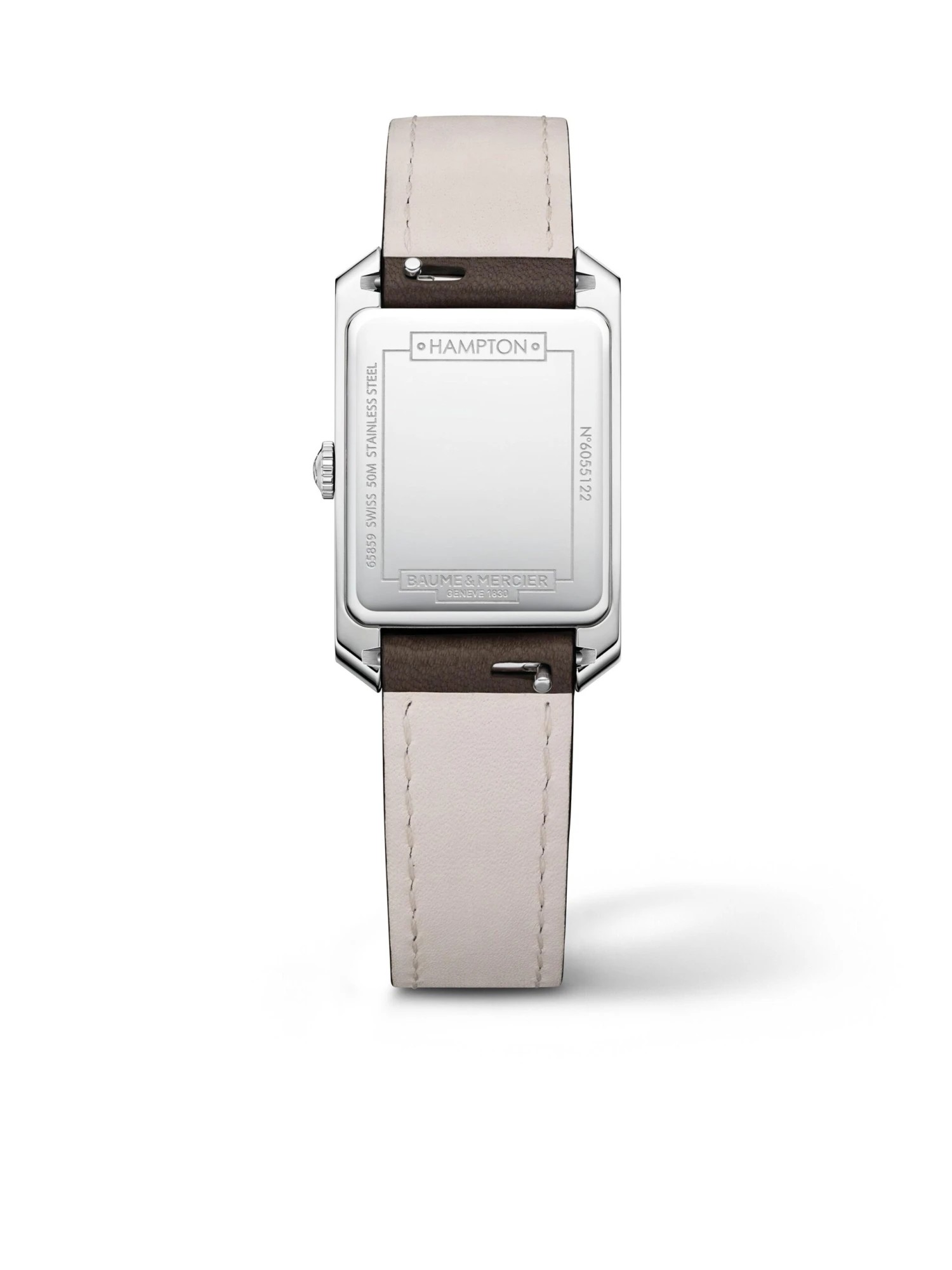 Unique icon with straight lines. The models in the Baume & Mercier Hampton collection continue to be characterized by the unique Art Deco style of the 1920s. The characteristic rectangular stainless steel case with a length of 35 millimeters is intentionally kept quite simple in the Hampton quartz ref. MOA10471. The silver-opalized dial with rhodium-plated Arabic numerals and markers and the famous sword hands is protected behind scratch-resistant sapphire crystal. The two-hand watch with taupe calfskin strap is water-resistant to 5 bar and is an elegant watch for every day.