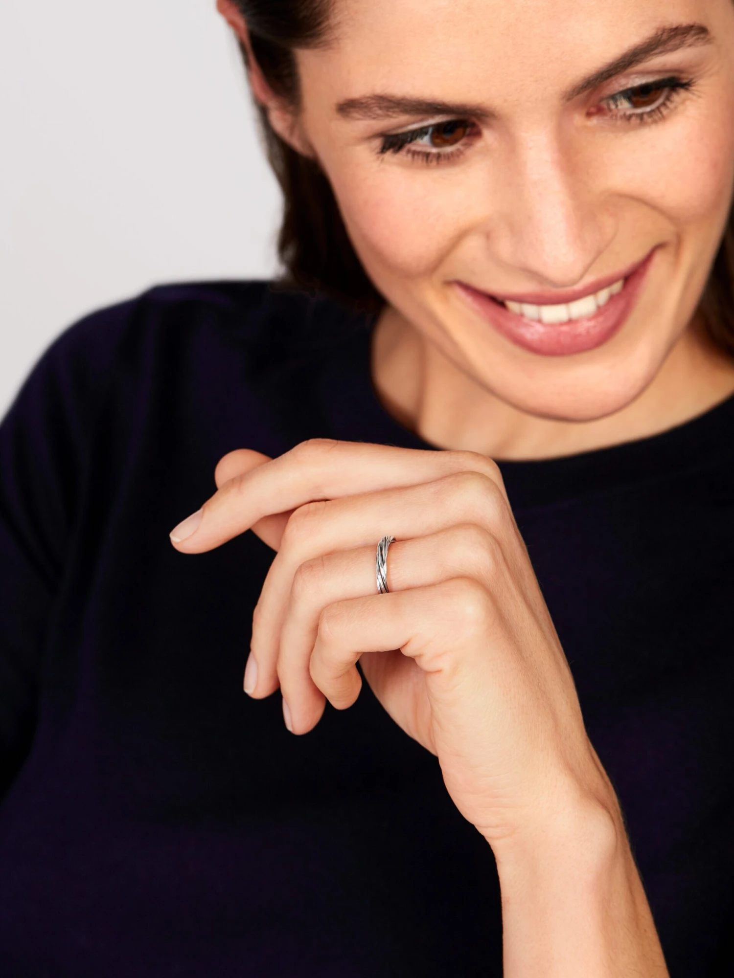 The Helioro XS BY KIM ring made of noble, radiant 18k white gold celebrates classic elegance and contemporary chic. In the XS variant, five strands of gold intertwine artistically to become a perfectly formed, unmistakable masterpiece. With a width of 2 mm, the ring made in our Atelier is so narrow that it can also be combined with other finger jewelry.