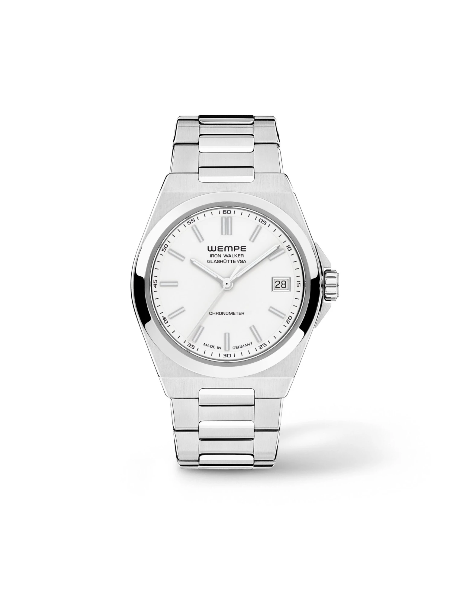 Inspired by the dauntless steel construction workers of the New York skyscrapers from the 1920s, the Wempe Glashütte I/SA Iron Walker collection distinguishes itself by the powerful combination of technical expertise and sparkling elegance. The individualized stainless-steel watch with sporty accents appeals above all to strong, self-assured women and offers more than a conventional three-hand watch: The framed date display at 3 o’clock and the striking baton hands with Super-Luminova® coating are delicate details that radiate a certain air of refinement. The 36-millimeter stainless-steel case with a height of only 9.30 millimeters houses a self-winding movement caliber ETA 2892-A2, is water-resistant to 10 bar, and features a white dial with a very clear appearance. A watch that shows elegance and character and fits perfectly around even the most delicate wrist thanks to its three-row stainless-steel bracelet.