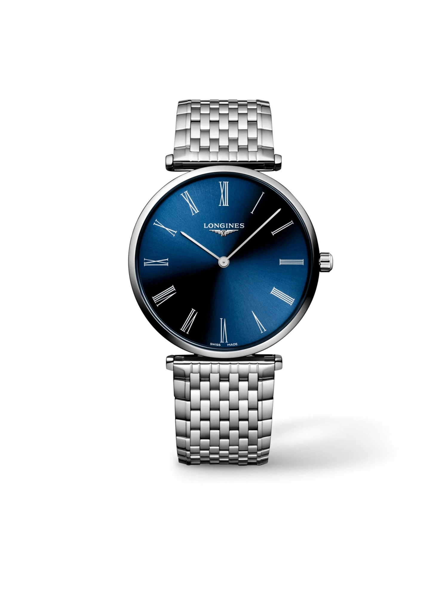 The all-steel La Grande Classique de Longines (Ref. L4.866.4.94.6) lives up to its name. Delicate hands, subtle Roman numerals and a dark blue sunburst dial give this watch a classic look that embodies elegance and sophistication. The case with a diameter of 38 millimeters and a height of only 5.4 millimeters houses the caliber L420, a precise quartz movement that hardy needs any maintenance.