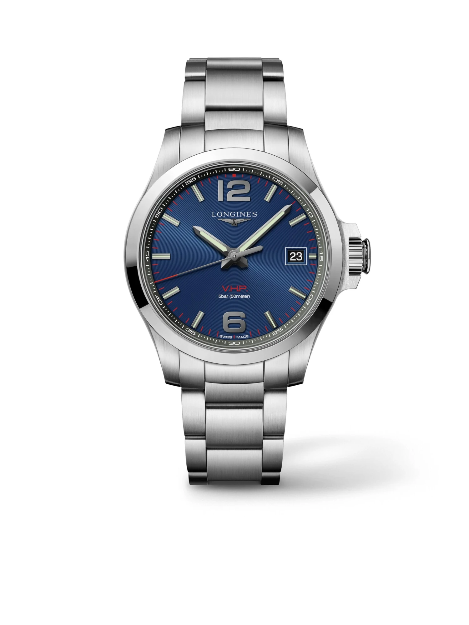 The Conquest V.H.P. brings new recognition to the quartz movement: It runs with an accuracy of plus/minus five seconds per year and the perpetual calendar remains correct until the year 2399. The stainless steel case with a diameter of 41 millimeters corresponds with the blue dial. The hands and markers are luminous and can therefore be read in the dark.