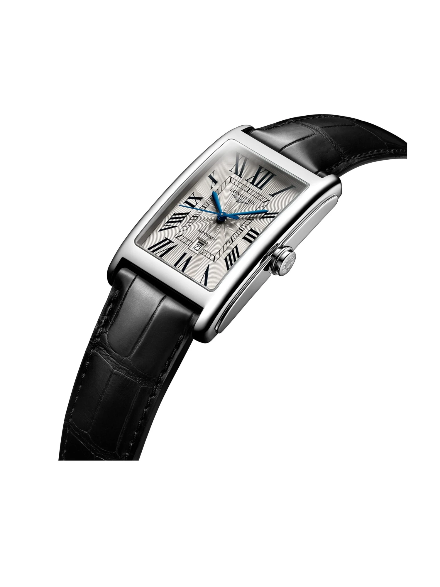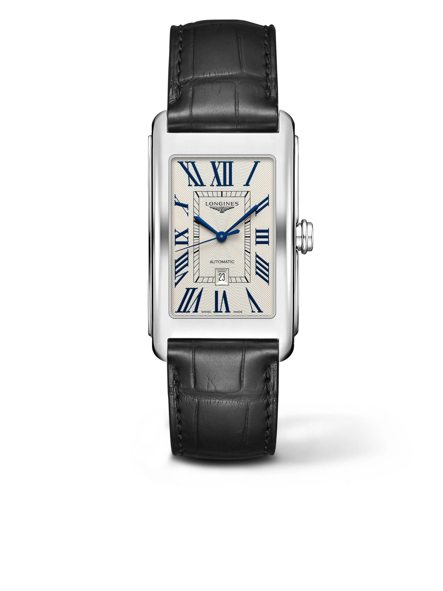 The Longines Elegance Dolce Vita Ref. LO300118 shines in a stainless-steel case measuring 28 by 47 millimeters. The silver-colored dial with “flinqué” decoration and Roman numerals features a date display at six o’clock. The blued steel hands add a casual splash of color to the classic self-winding watch on a black leather strap.