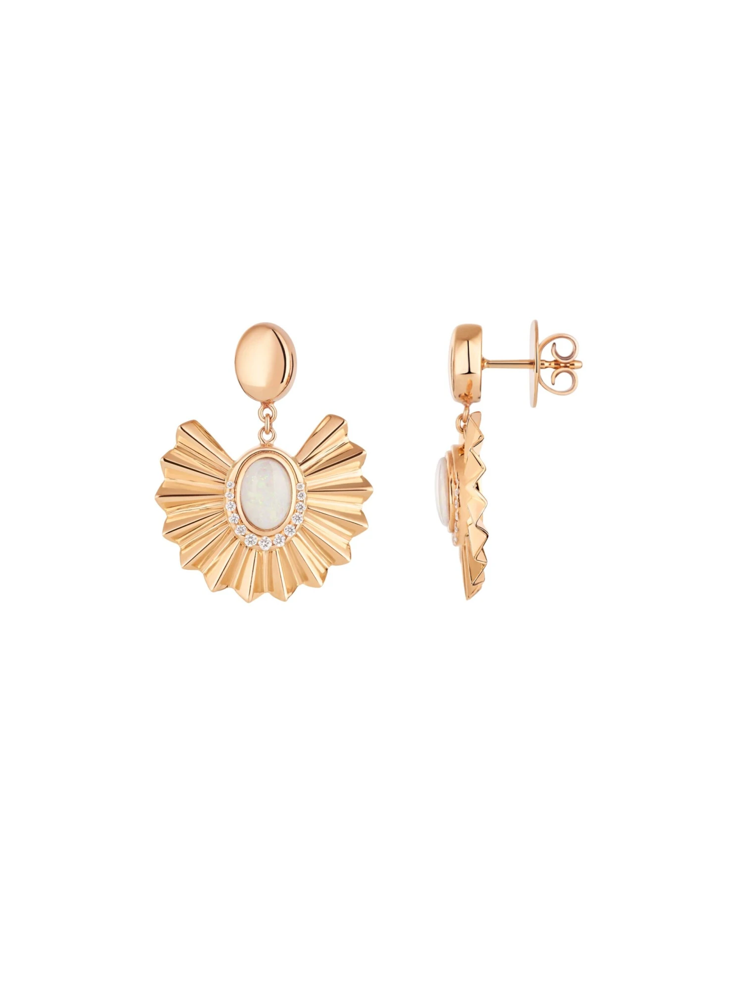 Enjoy the captivating charm of a rising sun. The Lucky Sun BY KIM earrings made of 18k rose gold incorporate the finesse of a pleated appearance combined with the radiance of a colored gemstone. The gleaming opals are framed by 26 brilliant-cut diamonds weighing 0.16 ct in total and are certain to capture people’s gaze. A jewelry creation made in Germany that precisely suits your style and adds that finishing touch to any look.