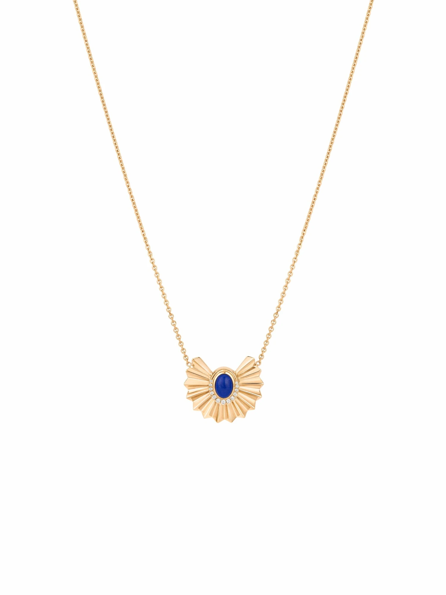 Enjoy the captivating charm of a rising sun. The Lucky Sun BY KIM pendant made of 18 k rose gold incorporates the finesse of a pleated appearance combined with the radiance of a colored gemstone. A lapis in a gleaming blue is surrounded by 13 brilliant-cut diamonds and captures people’s gaze, adding an extra-special touch to any look. A jewelry creation made in Germany that precisely suits your style and can be combined harmoniously with other jewelry pieces.
