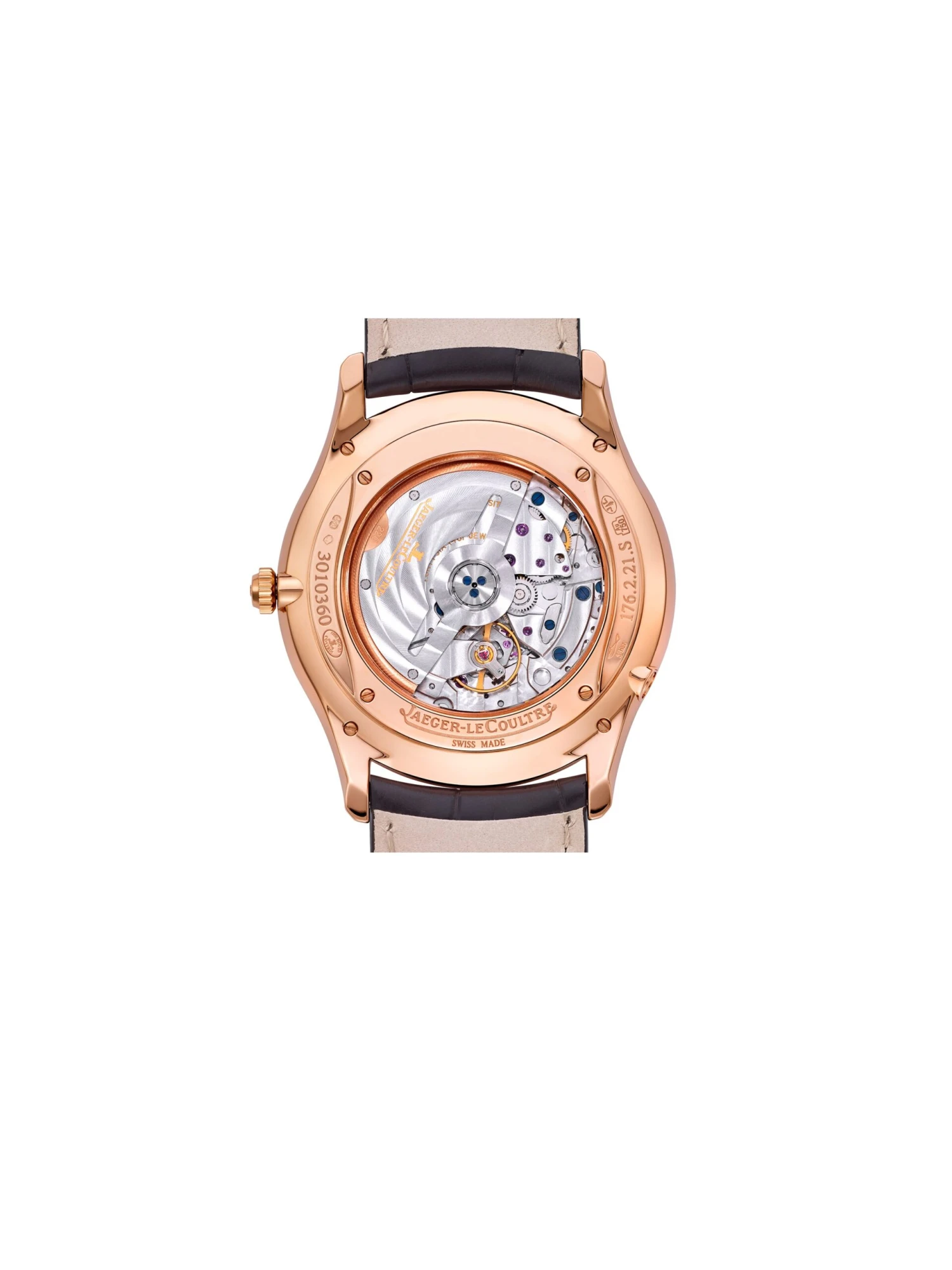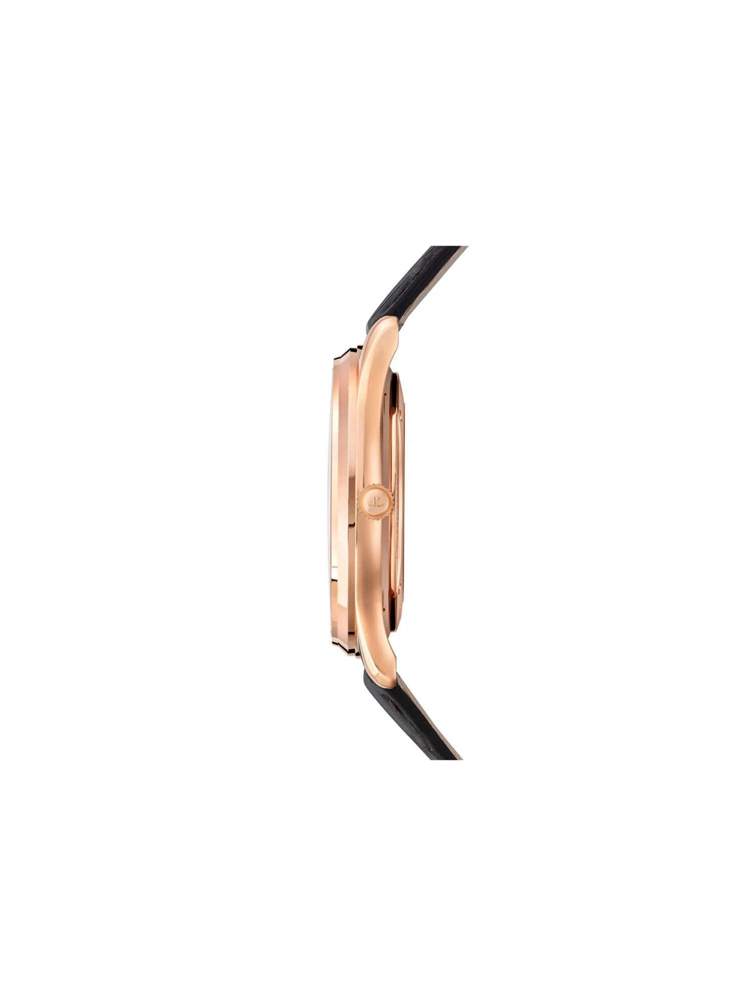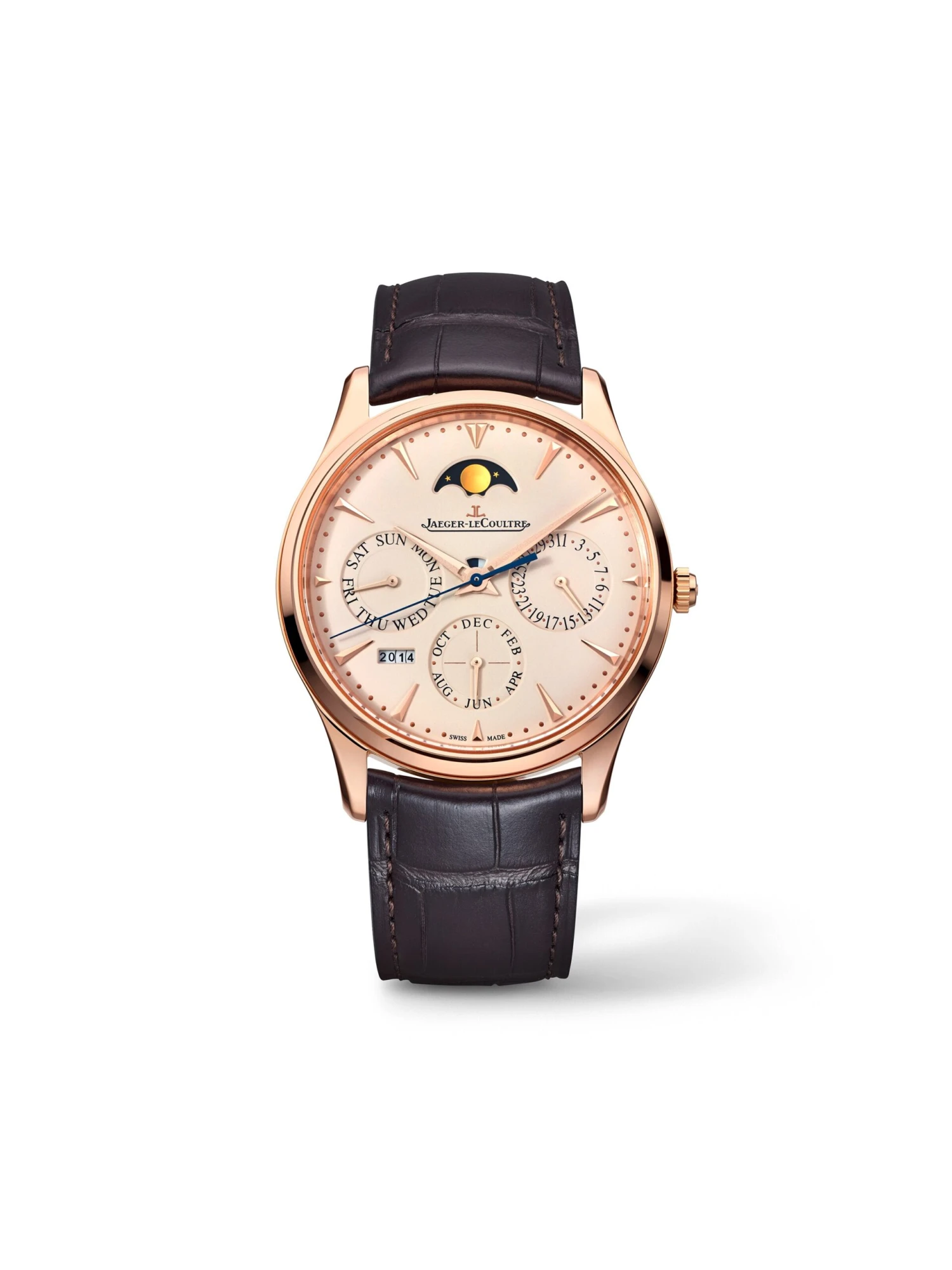 With its extra flat design and a wide range of functions, the Master Ultra Thin Perpetual meets the very highest demands. The displays for the perpetual calendar with counters for day of the week, date and month plus the moon phase at twelve o’clock are easy to read on the eggshell-colored dial. An in-house automatic caliber is fitted in a rose gold case, measuring 39 millimeters in diameter and 9.2 millimeters in height.