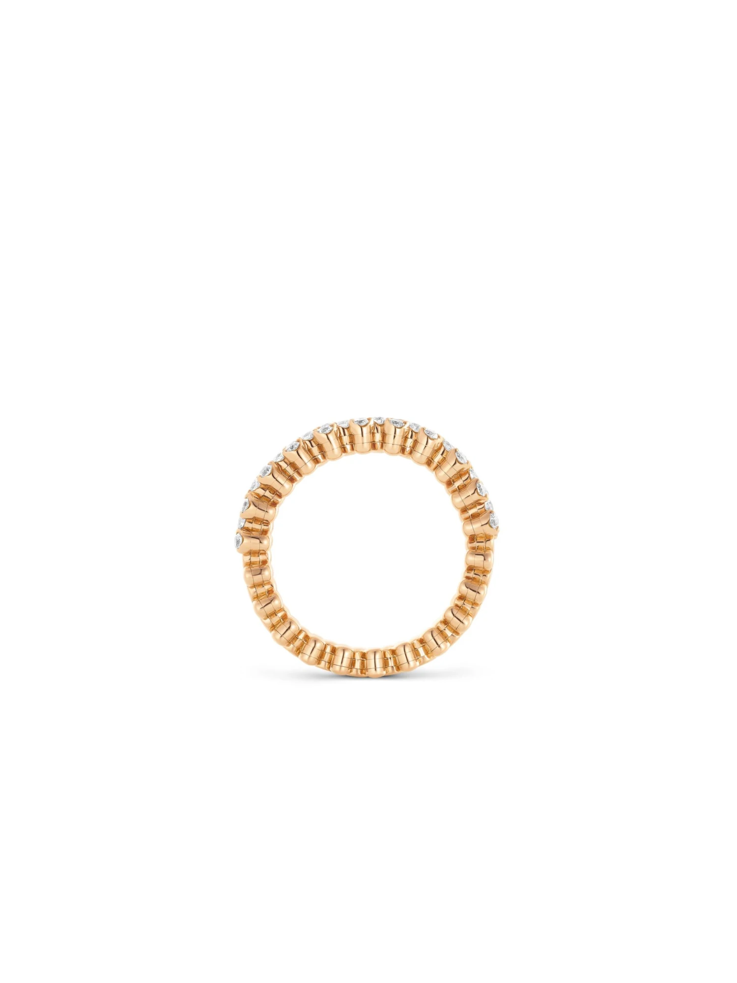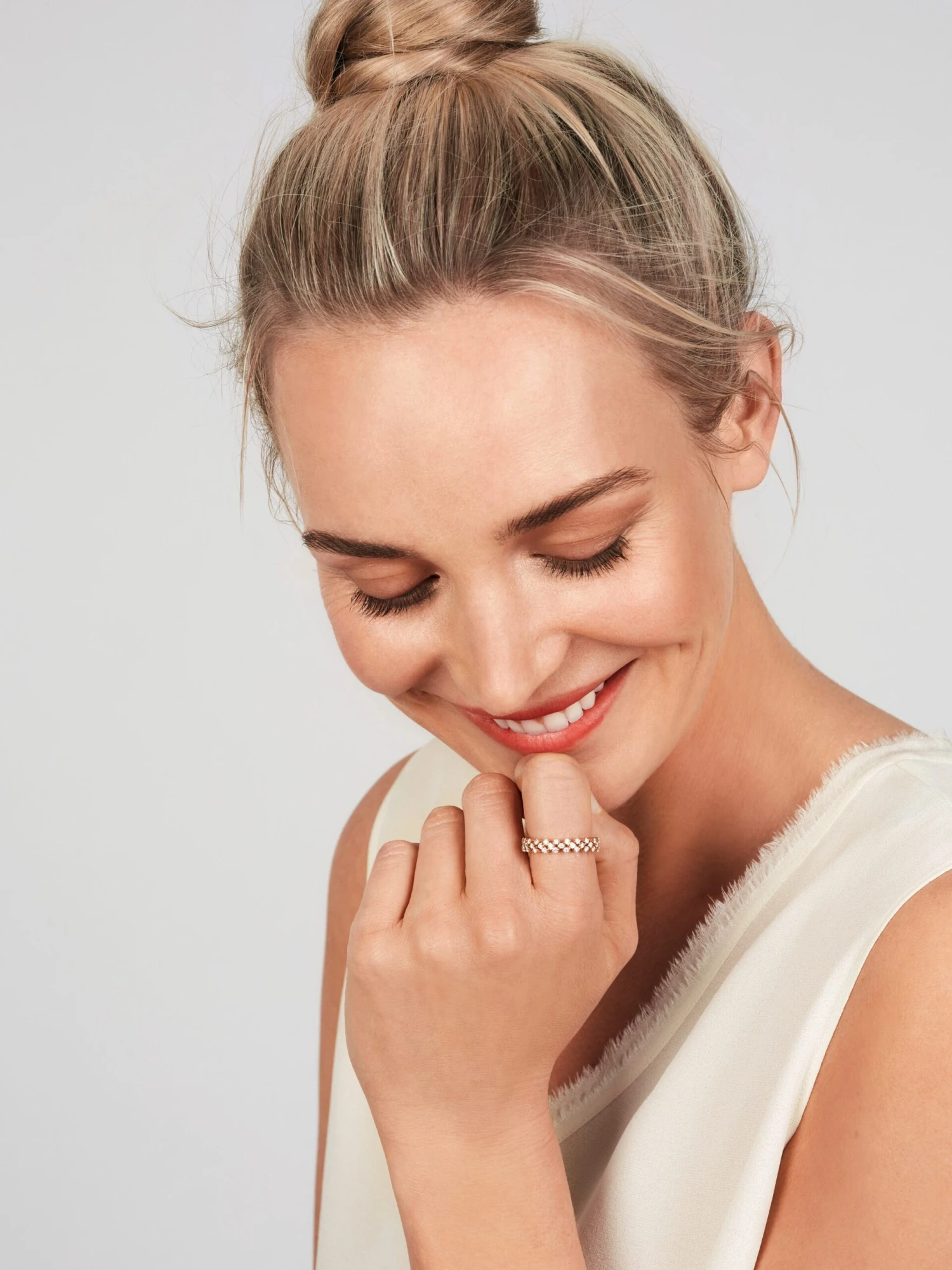 Whether worn on the little finger or the thumb – this ring cuts a good figure on every finger! Thanks to its innovative ring band, the Multisize Serafino Consoli for Wempe Classics ring can be pulled apart or pushed together resulting in a flexible ring size. Three staggered rows of 32 sparkling brilliant-cut diamonds 0.56 ct in total in a prong setting make the slim ring in 18k rose gold your new favorite jewelry item that is always the perfect fit.
