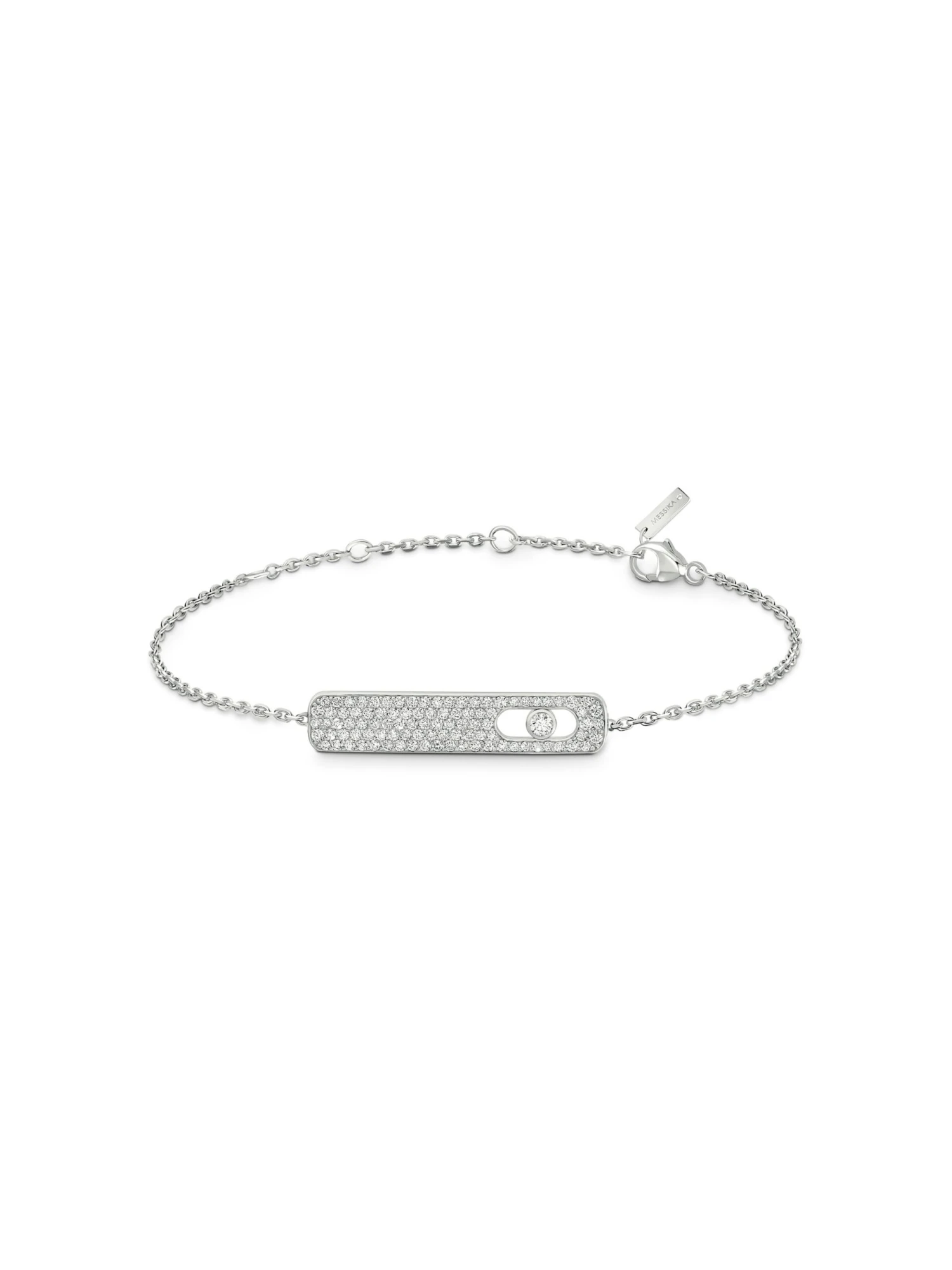 With the My First Diamond collection, Messika celebrates the diamond and monumentalizes it in the form of this elegant pavé bracelet. A single diamond sparkles in the limelight of the diamond-encrusted slide rail in 18k white gold. Thanks to its delicate cable chain, the bracelet is the perfect companion for everyday and makes a sparkling and glistening statement especially in the sunlight.