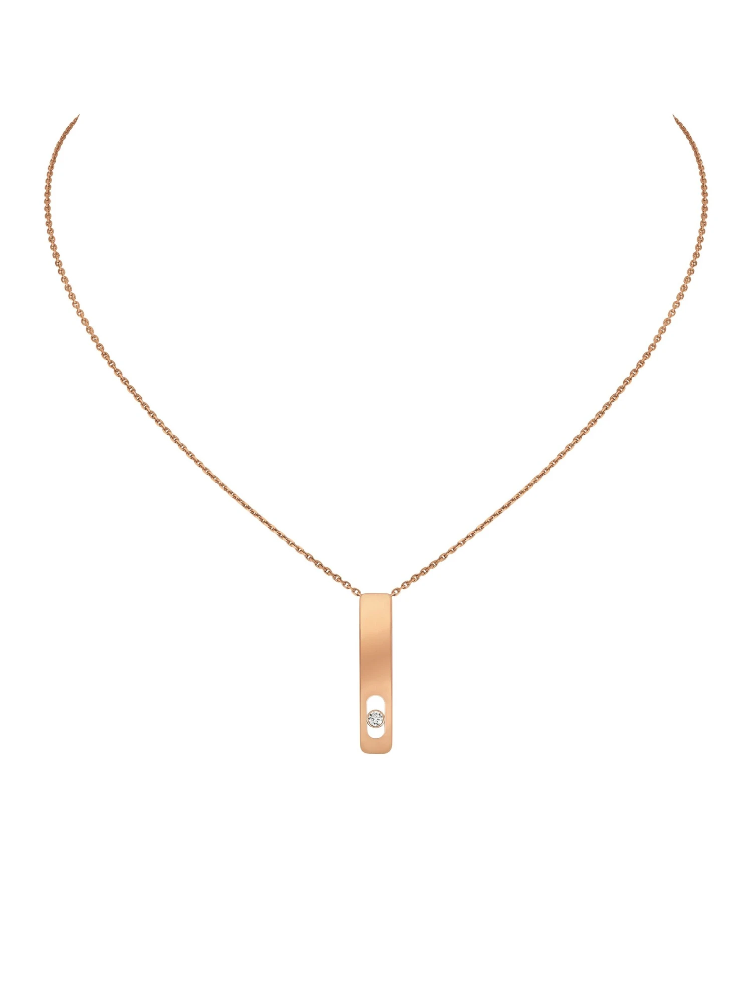 Sleek elegance, which sets a highlight when worn as a solo piece, but also makes a brilliant appearance combined with other jewelry items. The pendant of the My First Diamond necklace is a shimmering surface made of pure 18k rose gold. A single brilliant-cut diamond sets a sparkling accent at the end of the pendant. You can perfectly combine this minimalstic necklace with other graphic design necklaces. It looks gorgeous on dark blouses and dresses.