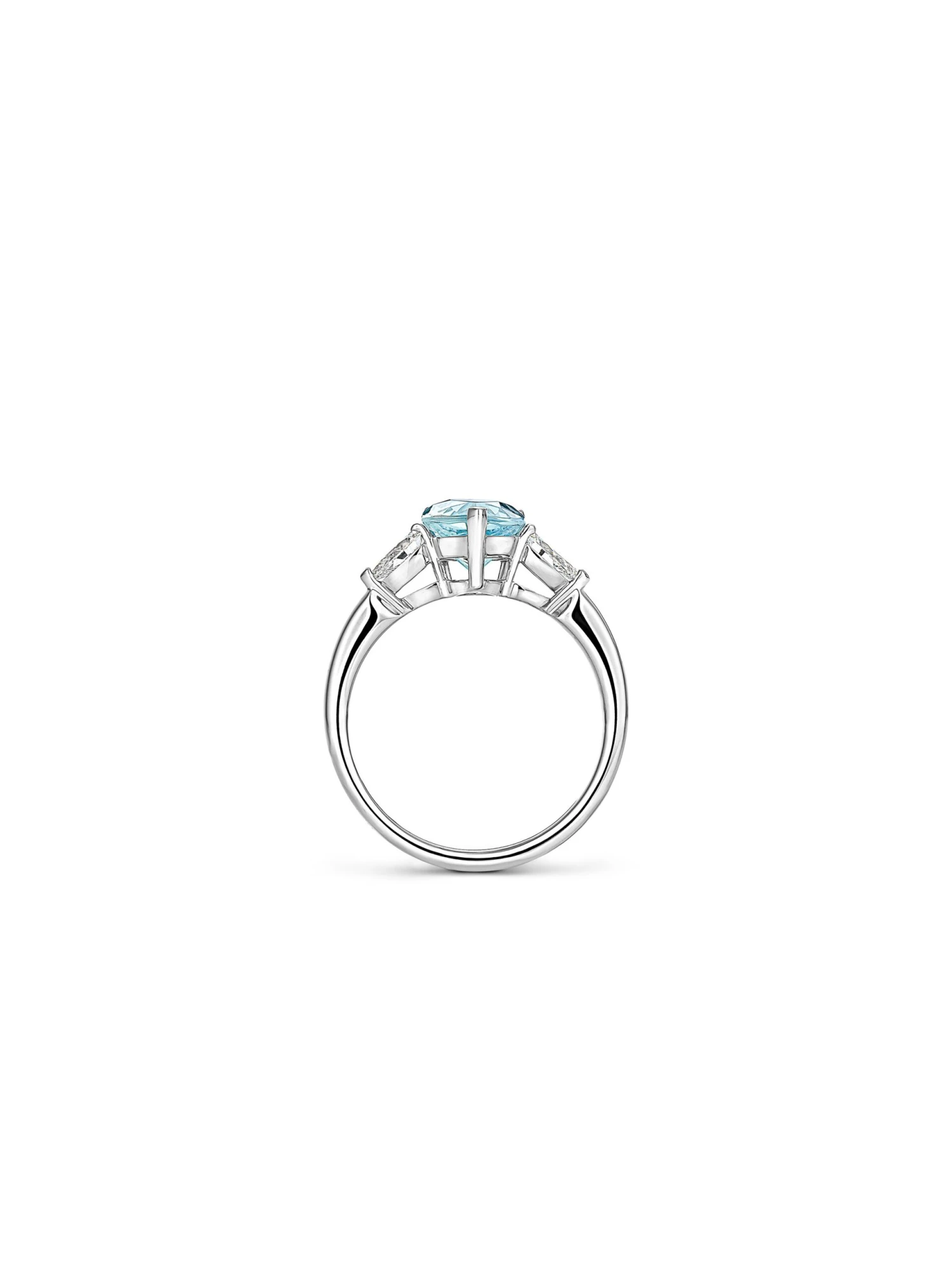 A pale blue, calling to mind clear ocean water, sparkles intensely in the gleam of two diamonds, just like the water surface in the sunlight. The One by Wempe Classics ring distinguishes itself by a radiant aquamarine of 1.93 ct in a sophisticated pear cut that attracts attention and gives nevertheless a delicate impression. The diamonds flanking the colored gemstone are also pear-shaped and harmoniously complement the design in combination with 18k white gold. A ring that brings summer joy also on cold days!