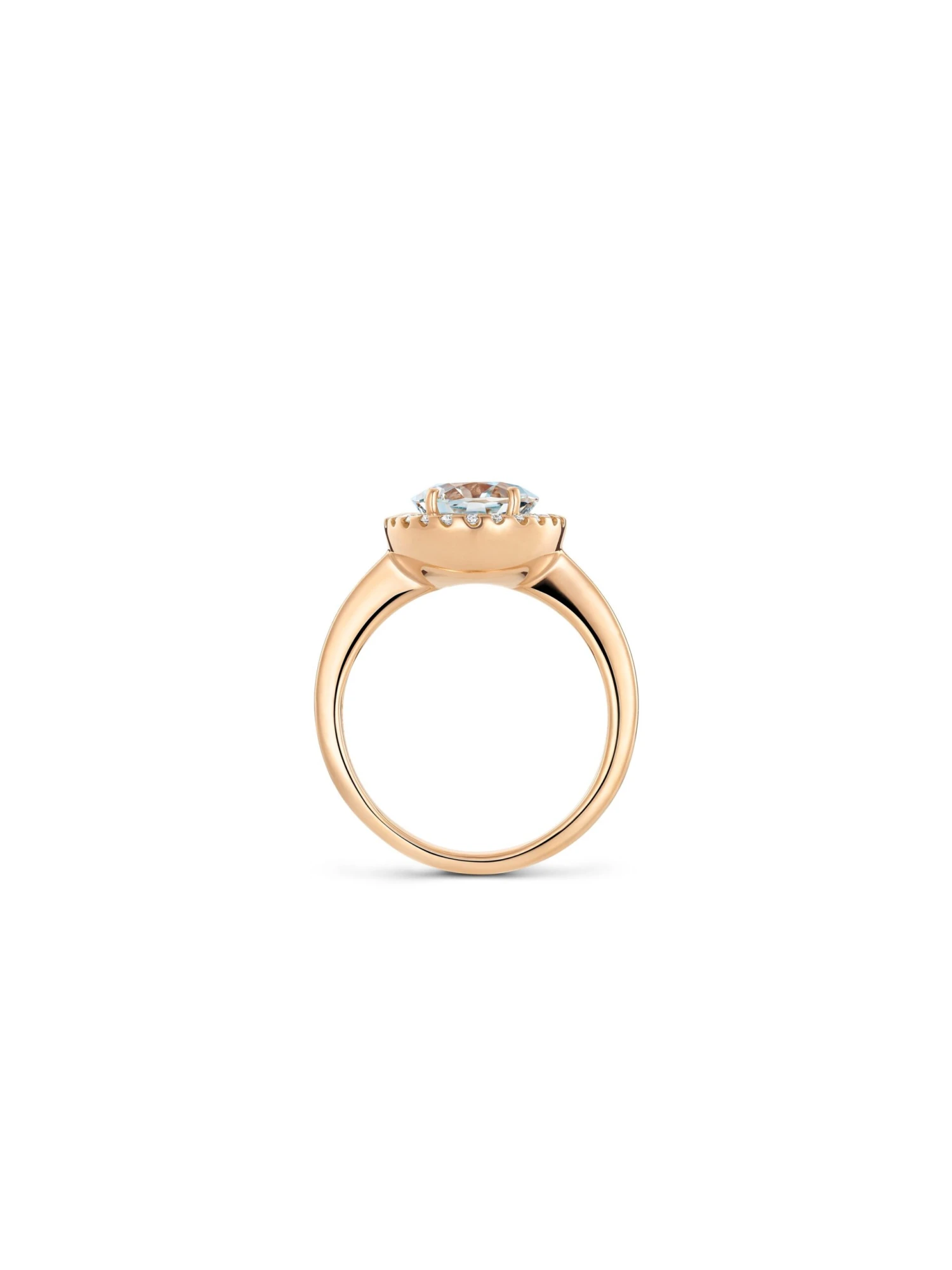 The timeless composition of the Opulence by Wempe Statements ring is both delicate, yet strong. Encircled by an oval wreath of 24 brilliant-cut diamonds of a total 0.24 ct, sparkling in the center of the jewelry piece is an aquamarine of 2.15 ct. The warm 18k rose gold highlights the sophisticated shine of the faceted colored gemstone and emphases its symbolism for love, purity and happiness.