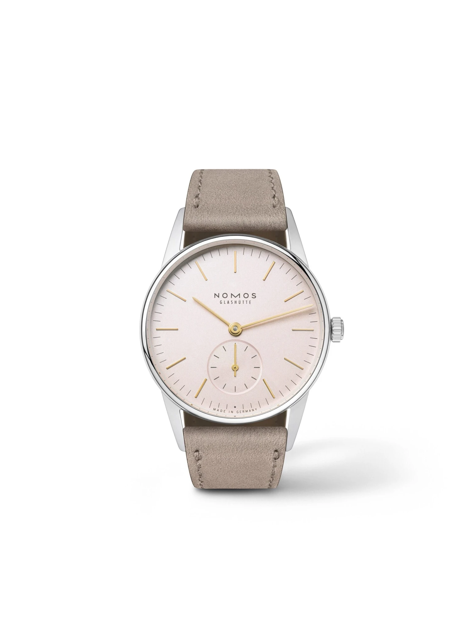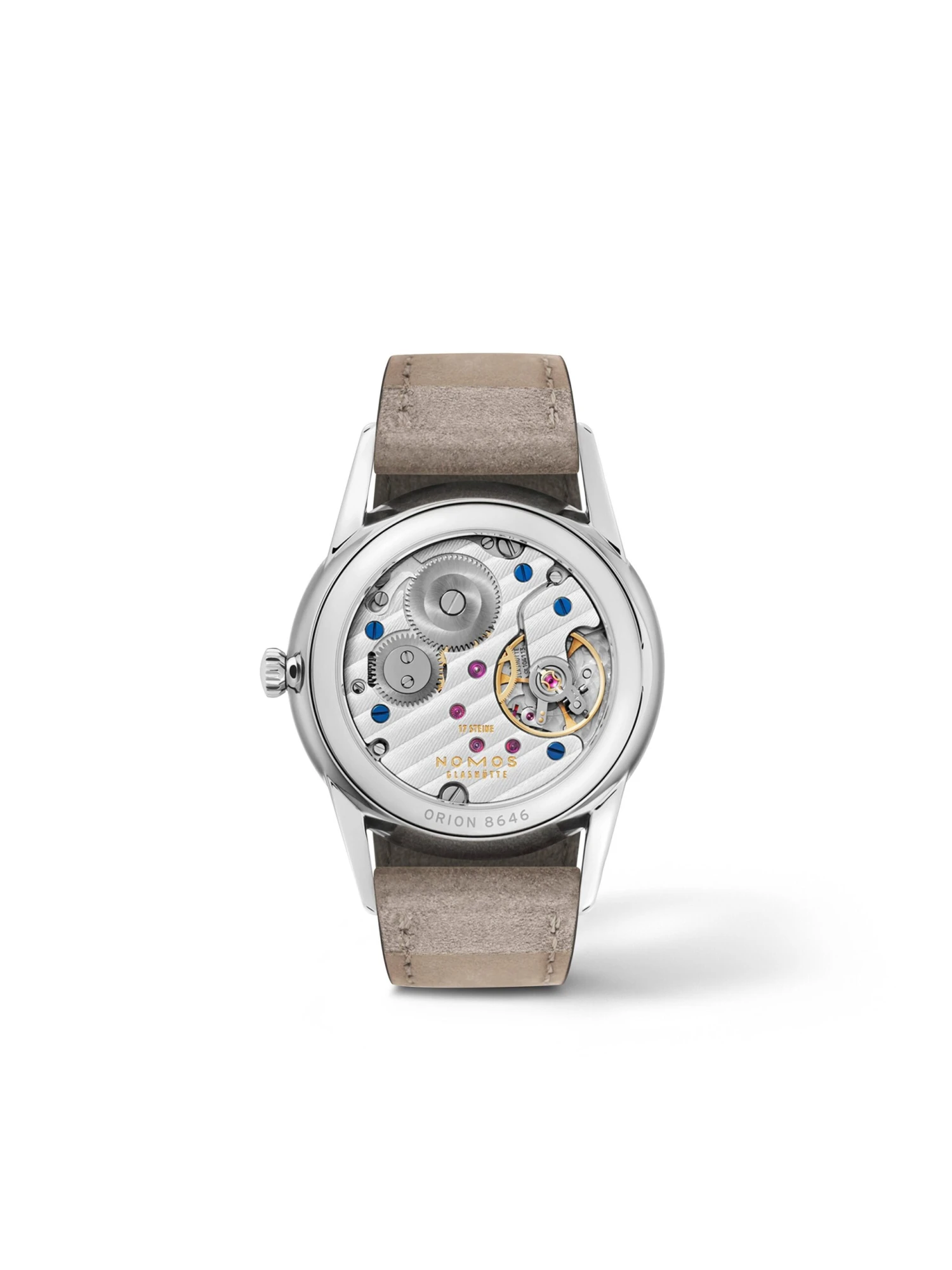 The Orion is the quiet star among NOMOS timepieces and a secret favorite of many. Almost all the designers who work for the watchmaker wear it. The curve of its exceptionally thin case (33 x 8.5 millimeters) and camber of the crystal ensure a timelessly elegant impression separate of any short-term fashion trends. The Orion 33 White, reference 325, is driven by a hand-wound Alpha caliber, a NOMOS movement from the very beginning. Its striking, quintessentially Glashütte embellishments are put on display through the sapphire-crystal case back. The Orion 33 White, reference 325, is provided with a light suede strap made of calfskin.