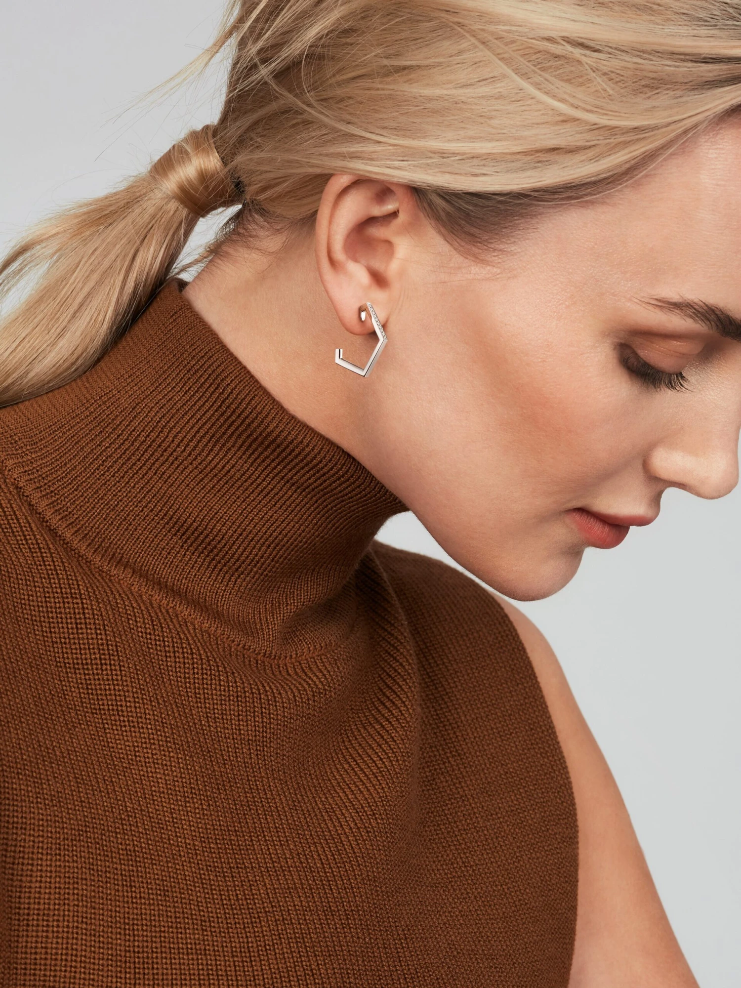 Rock n’ roll, baby! The exceptional Playlist BY KIM hoop earrings rock any outfit with their angular shape in 18k white gold, and are the perfect companion to the exciting jewelry design on your hand. A confident jewelry line for non-conformist women. Every woman finds her own style with Playlist BY KIM. Totally to the beat of your own drum.