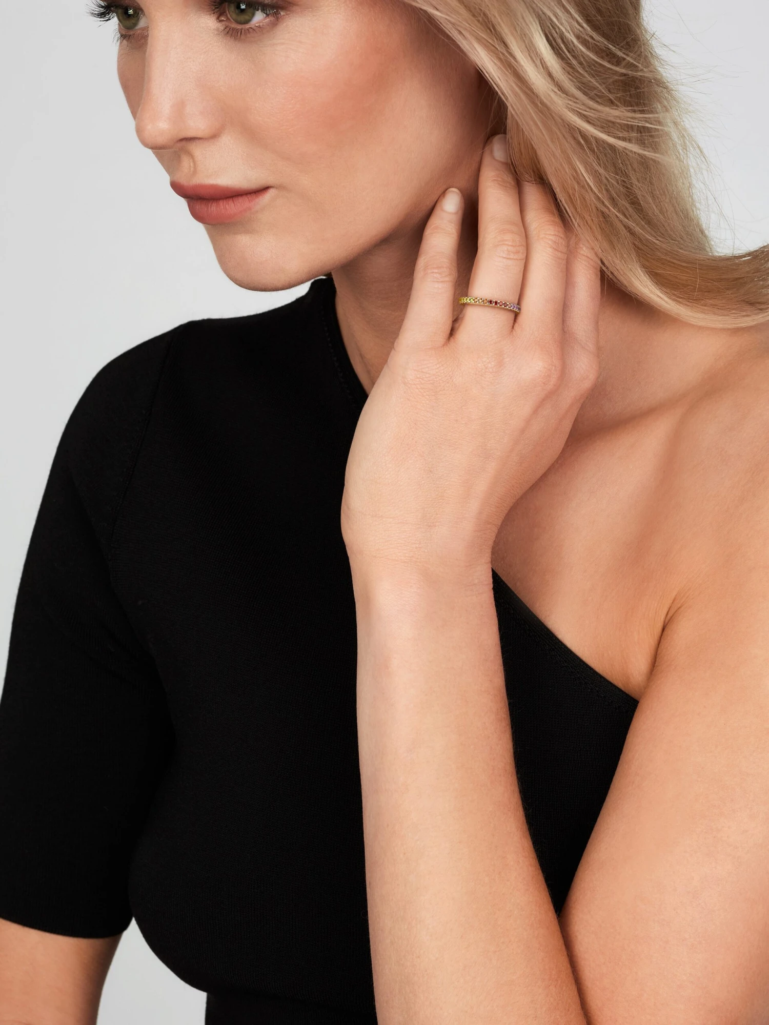 A rainbow raises the spirits and the Blu BY KIM eternity ring in warm 18k rose gold enchants us with its colorful lightness and reminds us of our last summer vacation. The 37 prong-set brilliant-cut diamonds with a total carat weight of 0.70 ct. make us dream of warm sunshine on our skin and carefree sundresses. Worn as a ring enhancer, this color miracle is the perfect complement for every declaration of love.