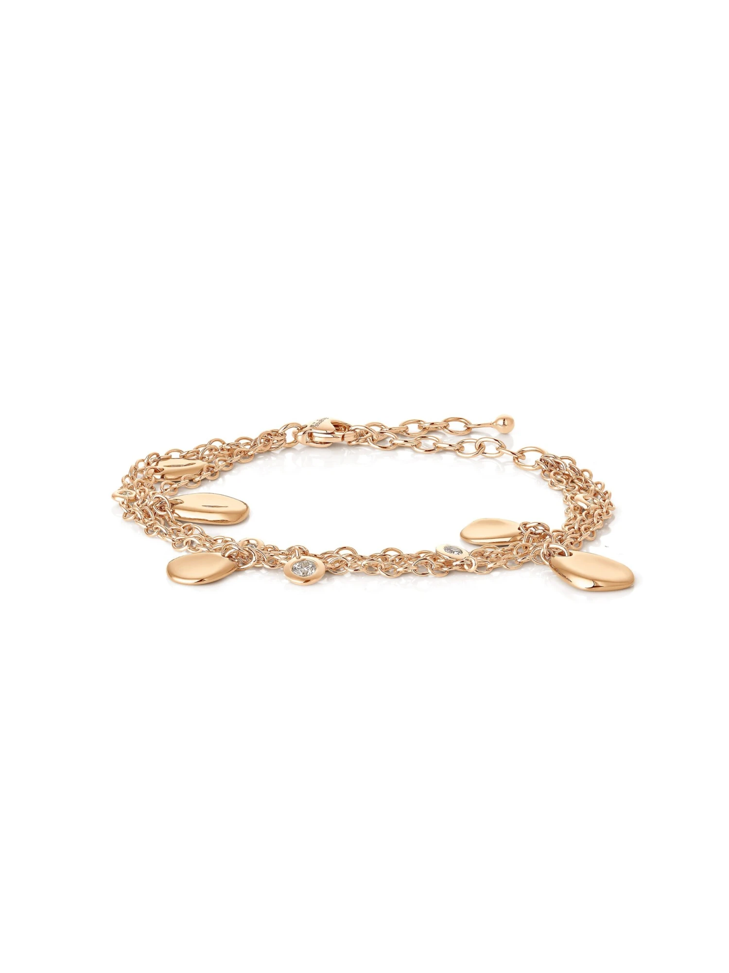 The Cosmos line is inspired by nature’s sculptural forces: The delicate pebble-shaped elements in 18k rose gold impress with their organic beauty. They alternate with 5 sparkling brilliant-cut diamonds of 0.27 ct on the three-strand bracelet. This jewelry item has its own personality and radiates sensuality, security, and power.