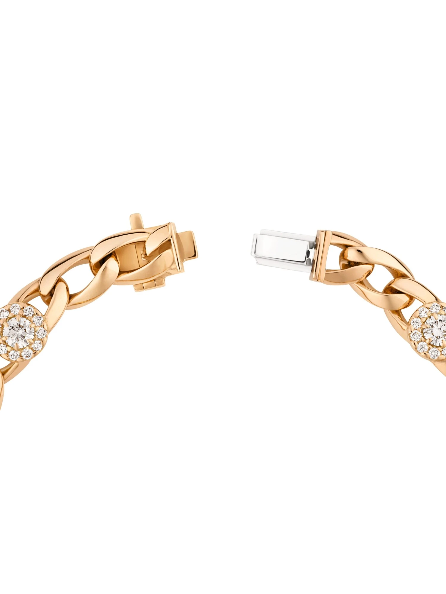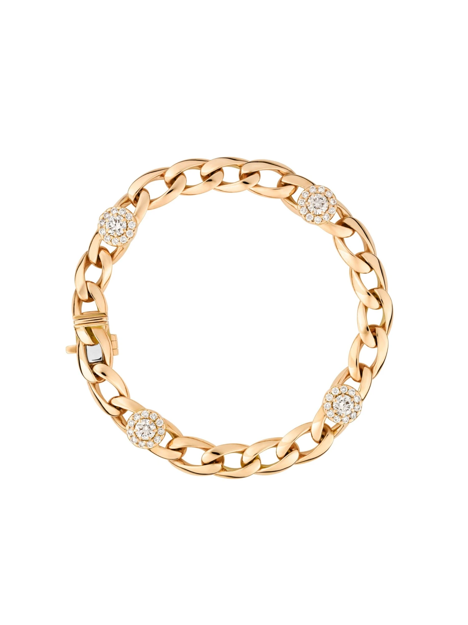 The Sensual Revival BY KIM bracelet combines fine elegance with a touch of understatement and sportiness. The powerful mix of a fashionable Revival curb link chain in warmly shimmering 18k rose gold and four radiant Crown elements is the perfect everyday companion because it is very comfortable to wear. The four large 1.32 ct brilliant-cut diamonds are each encircled by a fine wreath of smaller diamonds of 0.71 ct in total, providing a unique sparkle on the wrist.