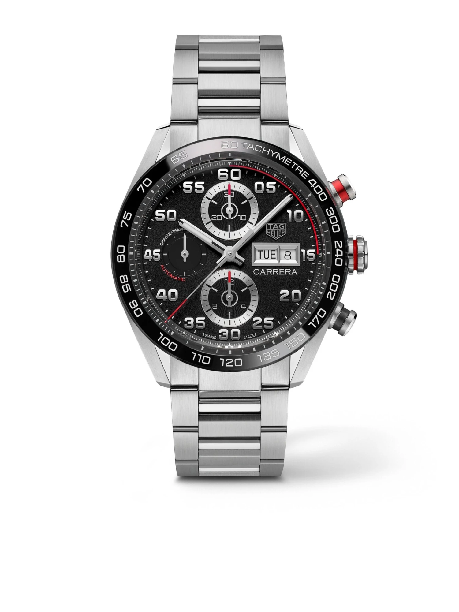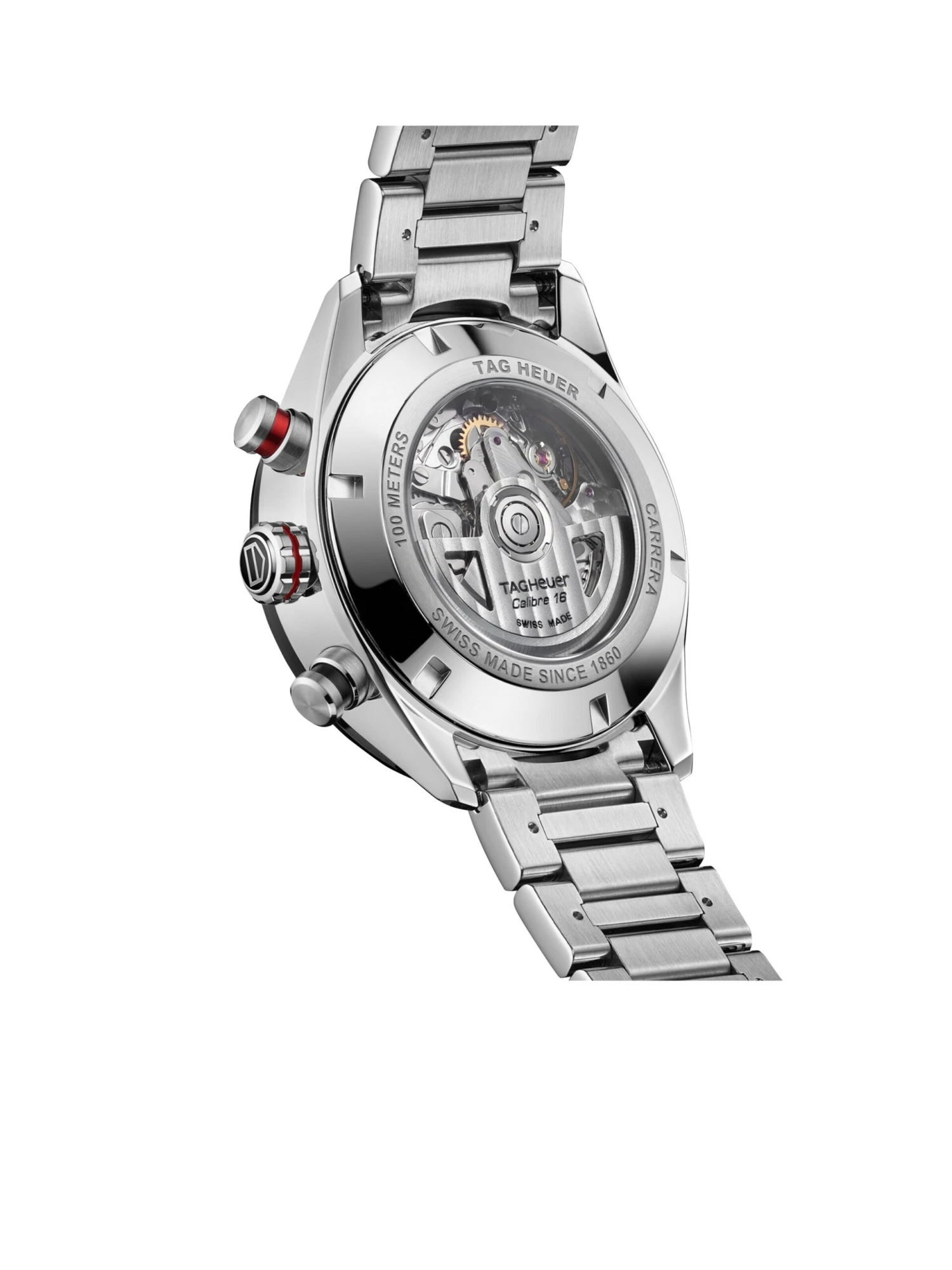 Developed by Jack Heuer in the early 1960s and named after the car race of the same name, the Carrera is specially tailored to the needs of professional racing drivers. Self-winding manufacture caliber Calibre 16 ticks within the Carrera Automatic Chronograph Ref. CBN2A1AA.BA0643. It is protected by a 44-millimeter case made of polished, finely brushed stainless steel with a black ceramic bezel. Bright red details on the dial and the buttons make the timepiece a real eye-catcher on your wrist. A three-row stainless-steel bracelet rounds off the athletic look.