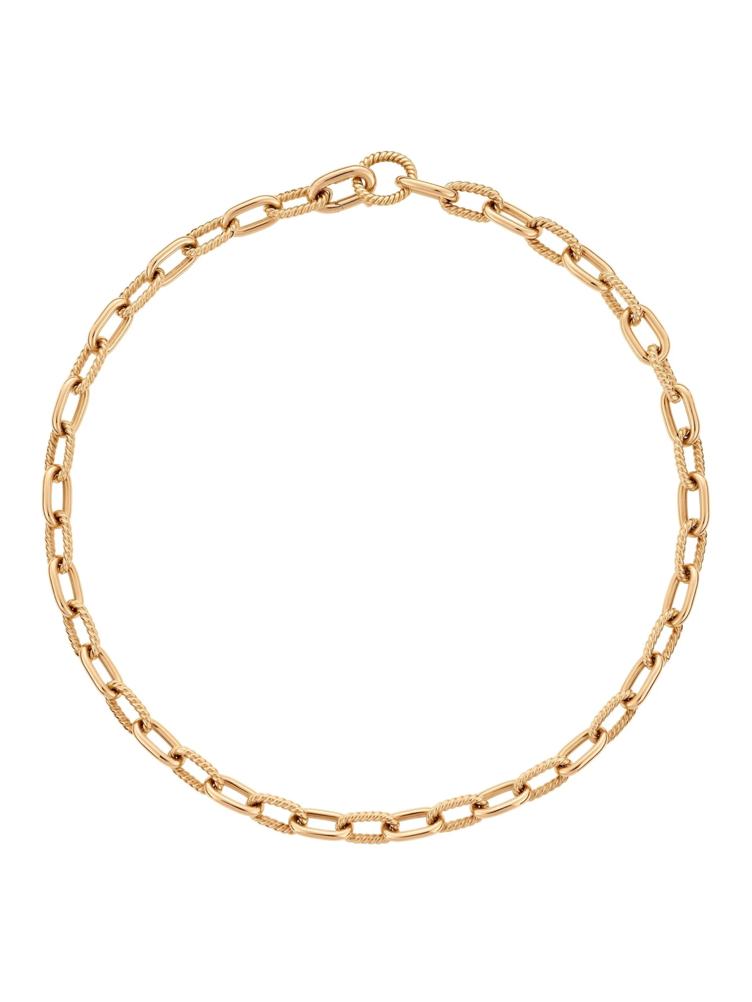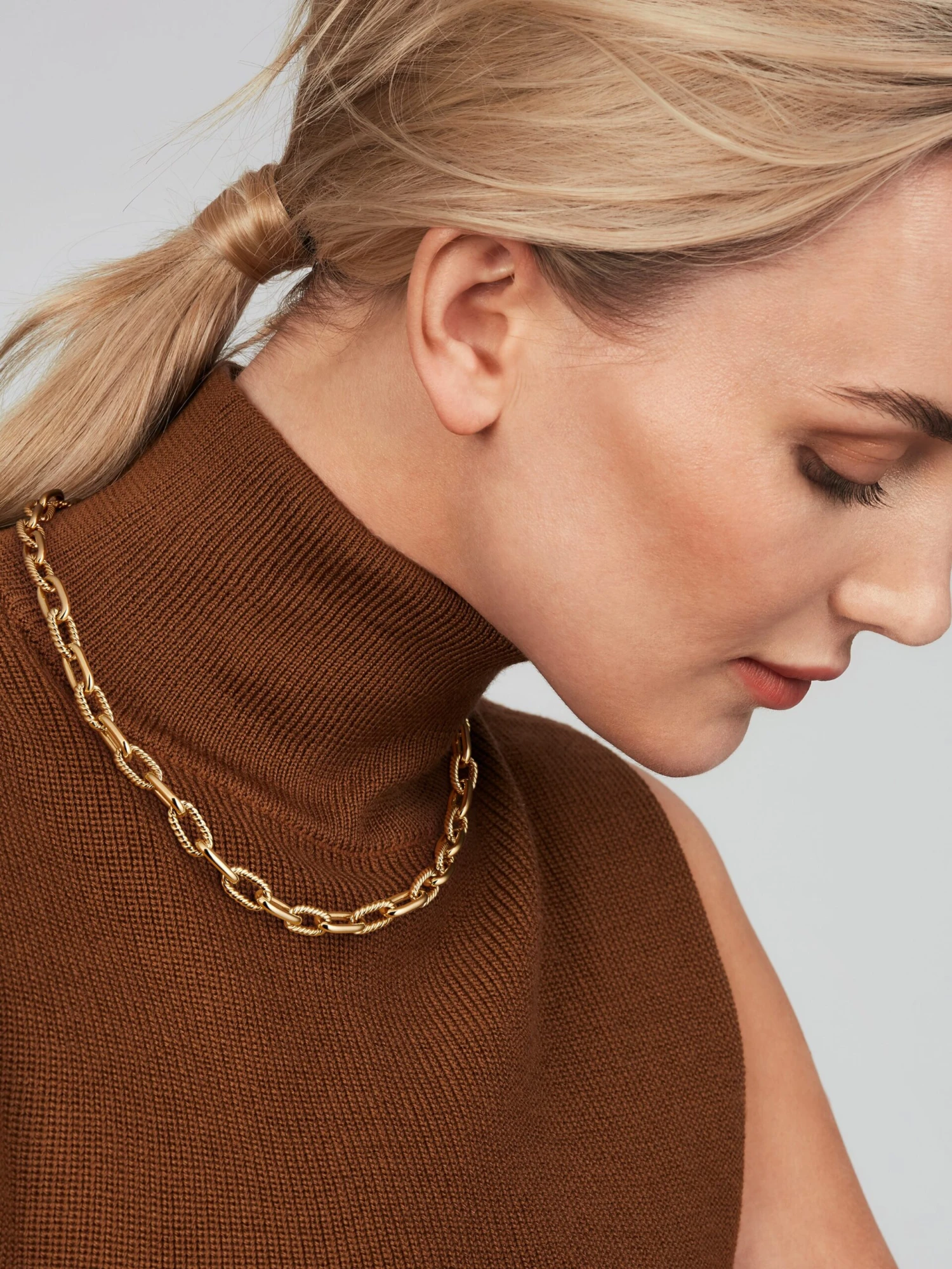 Huge link chains are still very popular in 2020. The striking Uptown by Wempe Statements necklace with its graphic elements creates a particularly avant-garde look. The 47 cm necklace in 18k yellow gold really comes into its own when worn in combination with polo-neck sweaters or stand-up collar pullovers. Since the motto in this extravagant jewelry trend is “More is More”, this statement piece can absolutely be combined with other necklaces.