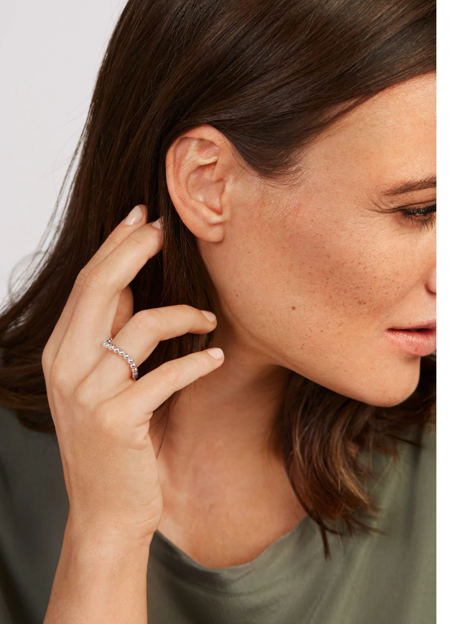 With its energetic line and playful design vocabulary, the Voyage BY KIM ring, handmade in the Wempe Atelier, sets standards. Significant: its lenticular-shaped and flattened elements arranged in a sequence. This 18k white gold ring is pleasant to wear and can be combined well with other models in the line. Perfect for all those looking for an everyday favorite.
