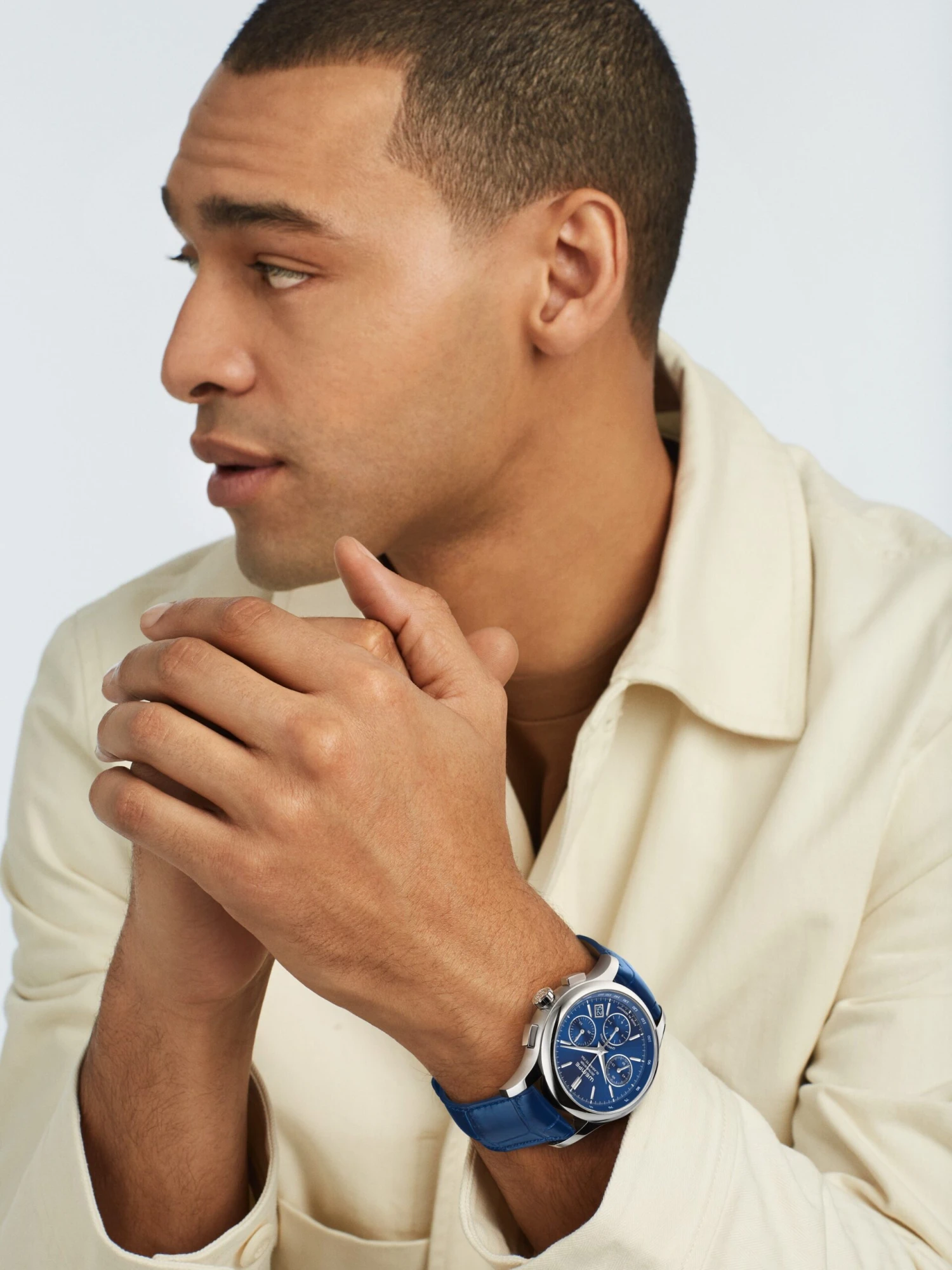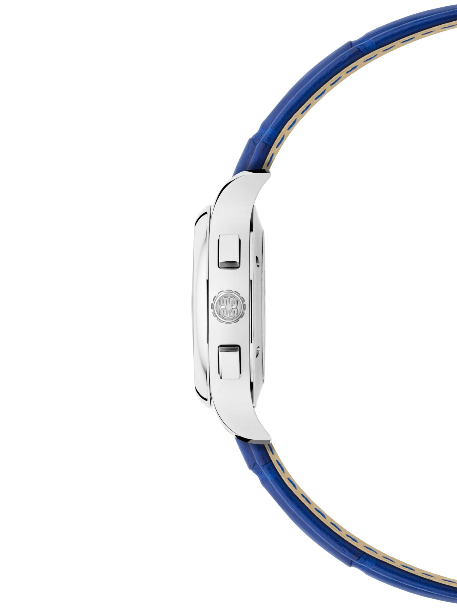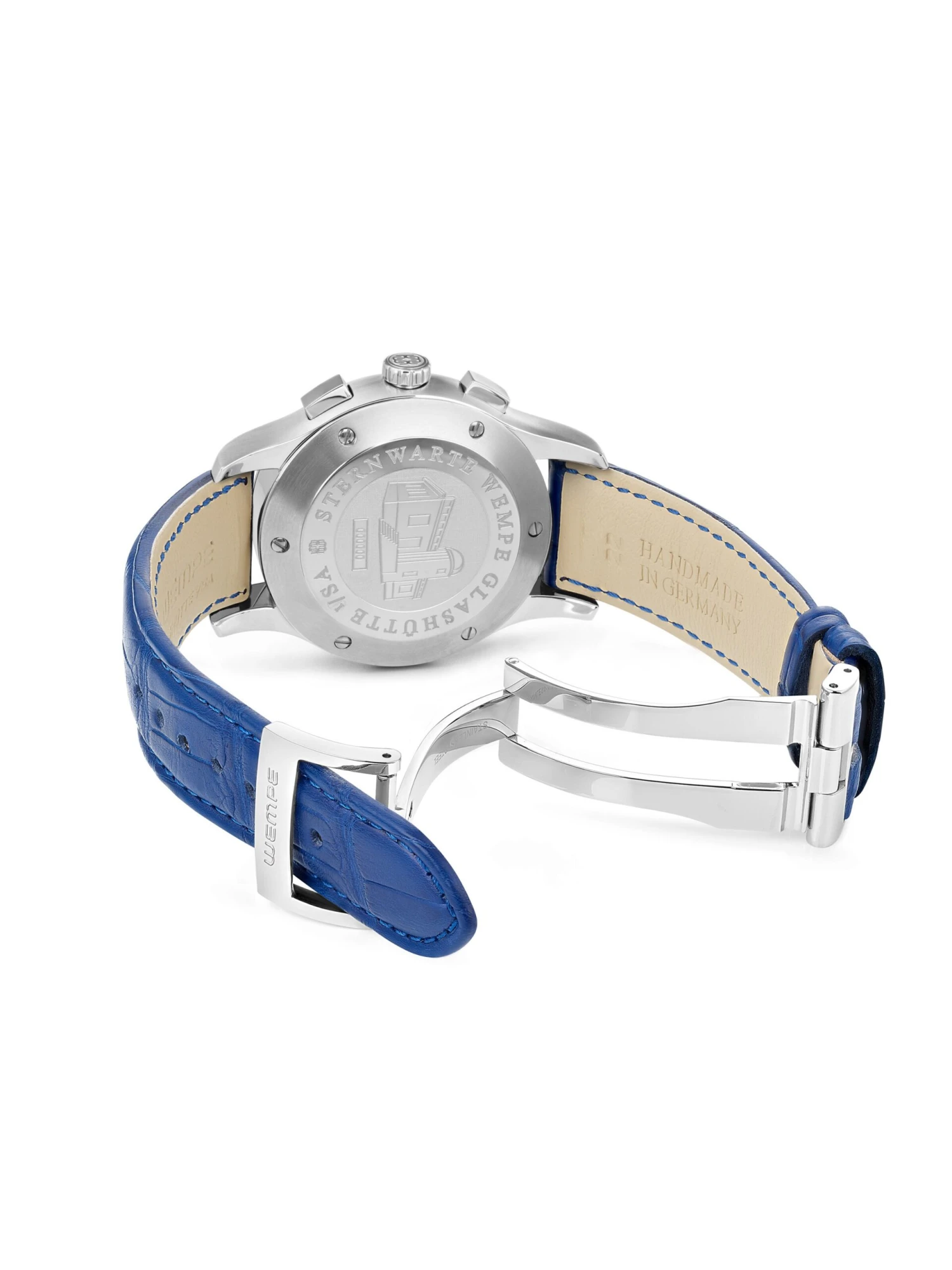 Accurate, complex, and an exquisite design: The Zeitmeister Chronograph self-winding watch possesses an additional mechanism for starting, stopping, and resetting the seconds display. In addition to mechanical finesse, this reliable chronometer has a classic, round, stainless-steel case and an elegant blue alligator-leather strap which, altogether, will most certainly impress the beholder. The blue totalizers are color-coordinated with the blue dial in the best way possible.