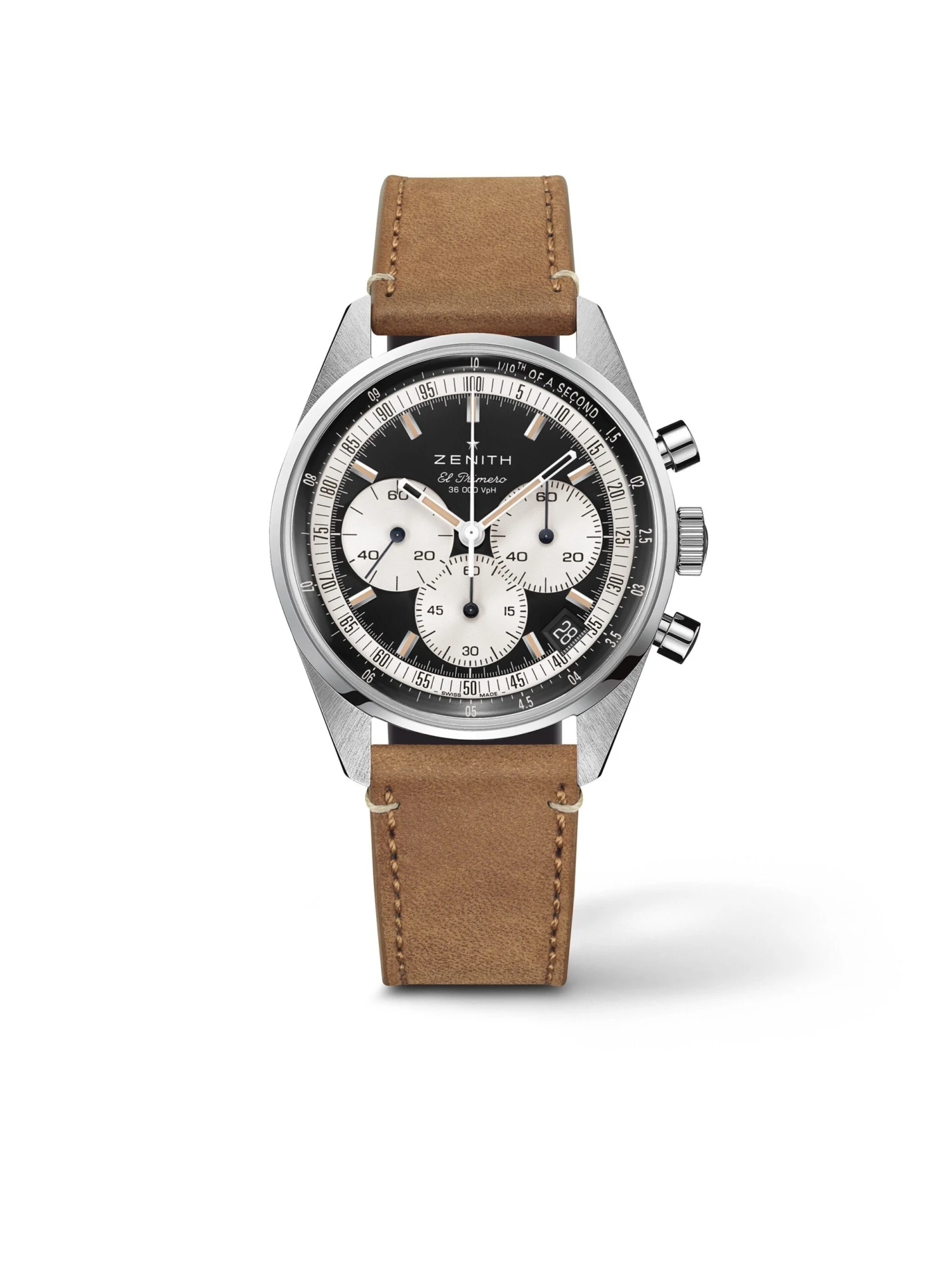 With the Chronomaster Original (Ref. 03.3200.3600/21.C903), Zenith revives the design of the iconic A386. In the popular size of 38 millimeters in diameter, the larger-looking black dial features the three overlapping totalizers in the brand’s colors. The harmonious arrangement is enclosed by a white seconds scale, as well as a black outer scale that shows the exact measurement of tenths of a second. Suitable for both men and women, this watch is powered by the high-frequency self-winding chronograph movement El Primero 3600, which impresses with 36,000 vibrations per hour as well as a power reserve of up to 60 hours and can be observed through a sapphire crystal caseback. A light brown tanned leather strap completes the high-contrast vintage look of this versatile timepiece, which flatters slender wrists in particular.