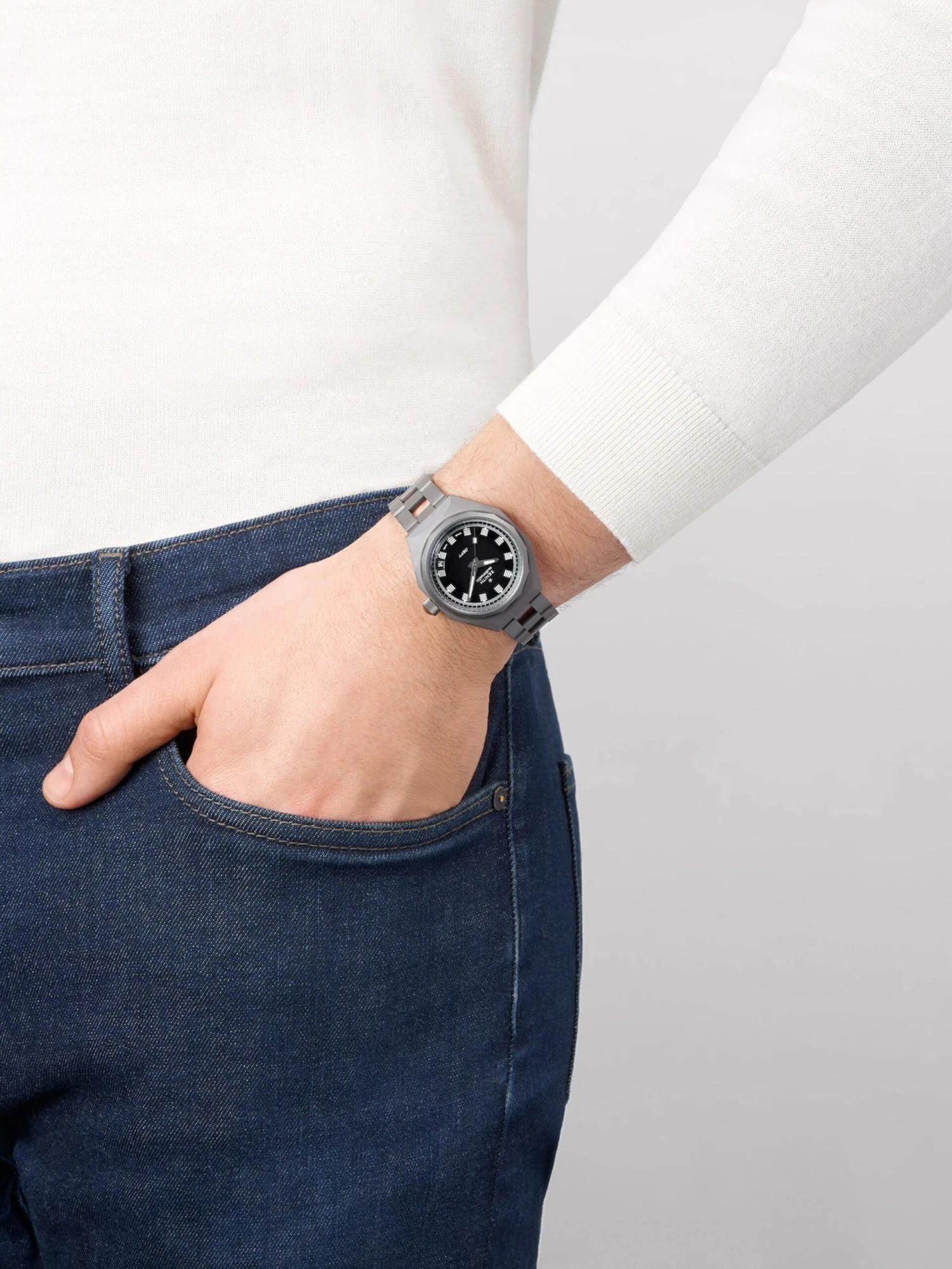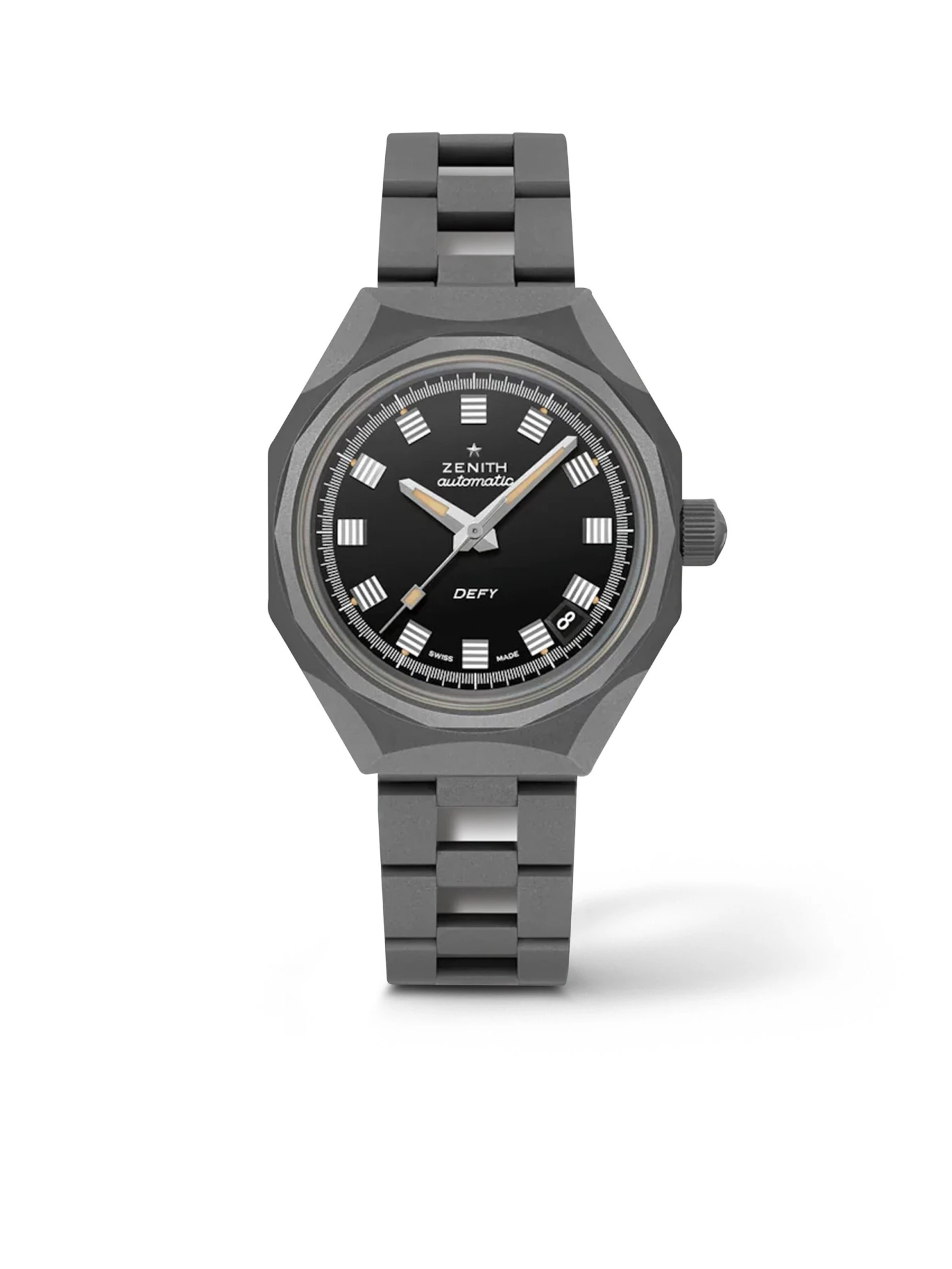 The 37-millimeter Defy Revival Shadow (Ref.97.A3642.670/21.M3642) is a bold reedition that celebrates the history of Zenith. Enclosed in a titanium case with a 14-sided bezel, the matte black dial with a date display between four and five o’clock features the unusual hour markers that already adorned the very first Defy model from 1969. The ladder bracelet – in this version also made of titanium – is also true to the original model. Technically, however, the watch, which is water-resistant up to 300 meters, keeps up with the times. Inside the case, there is a state-of-the-art self-winding movement, the caliber ELITE 670, with a remarkable power reserve of up to 50 hours.