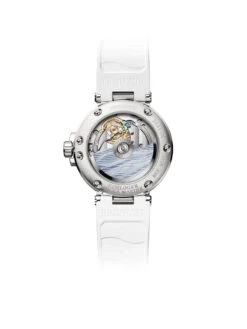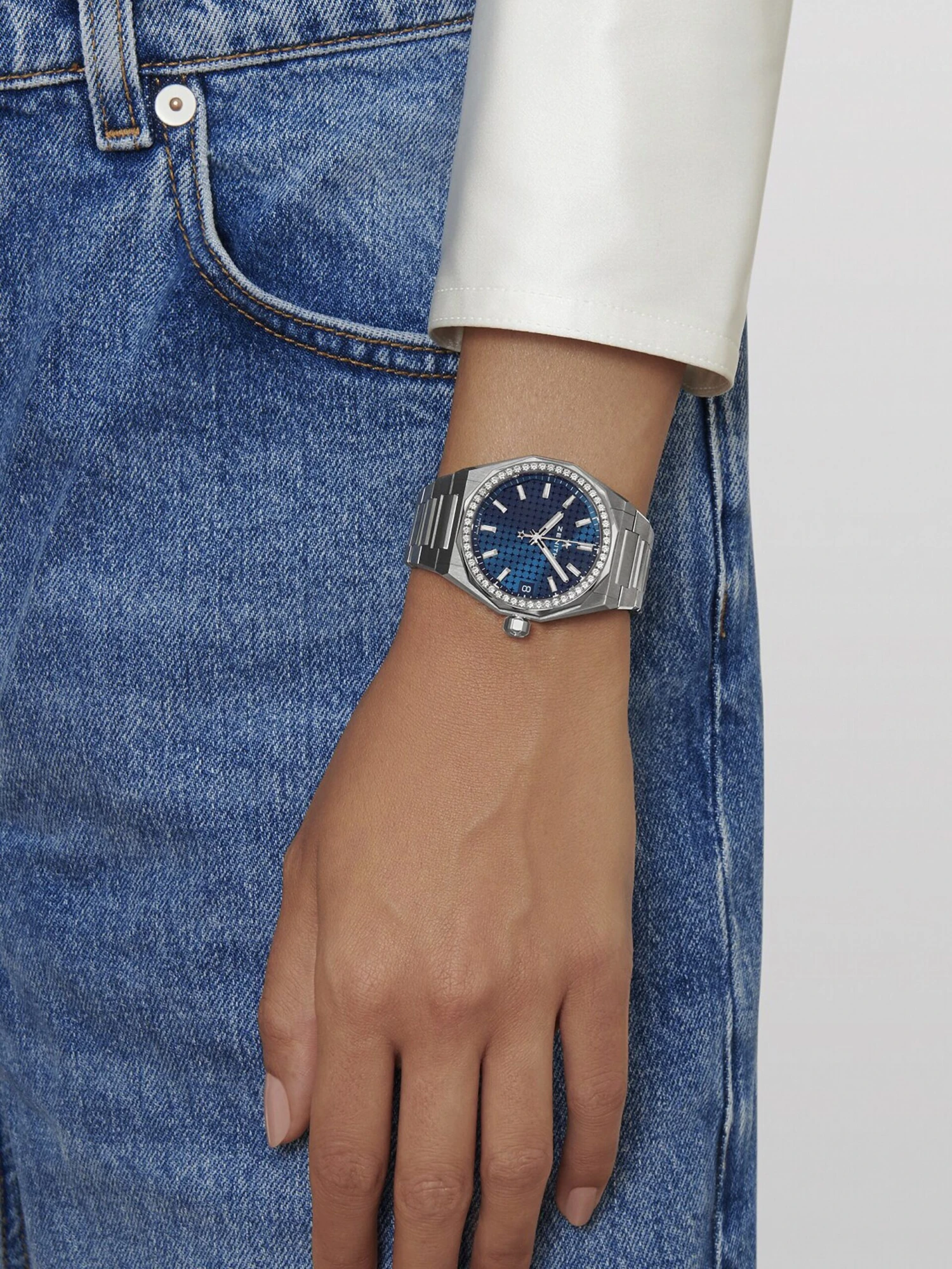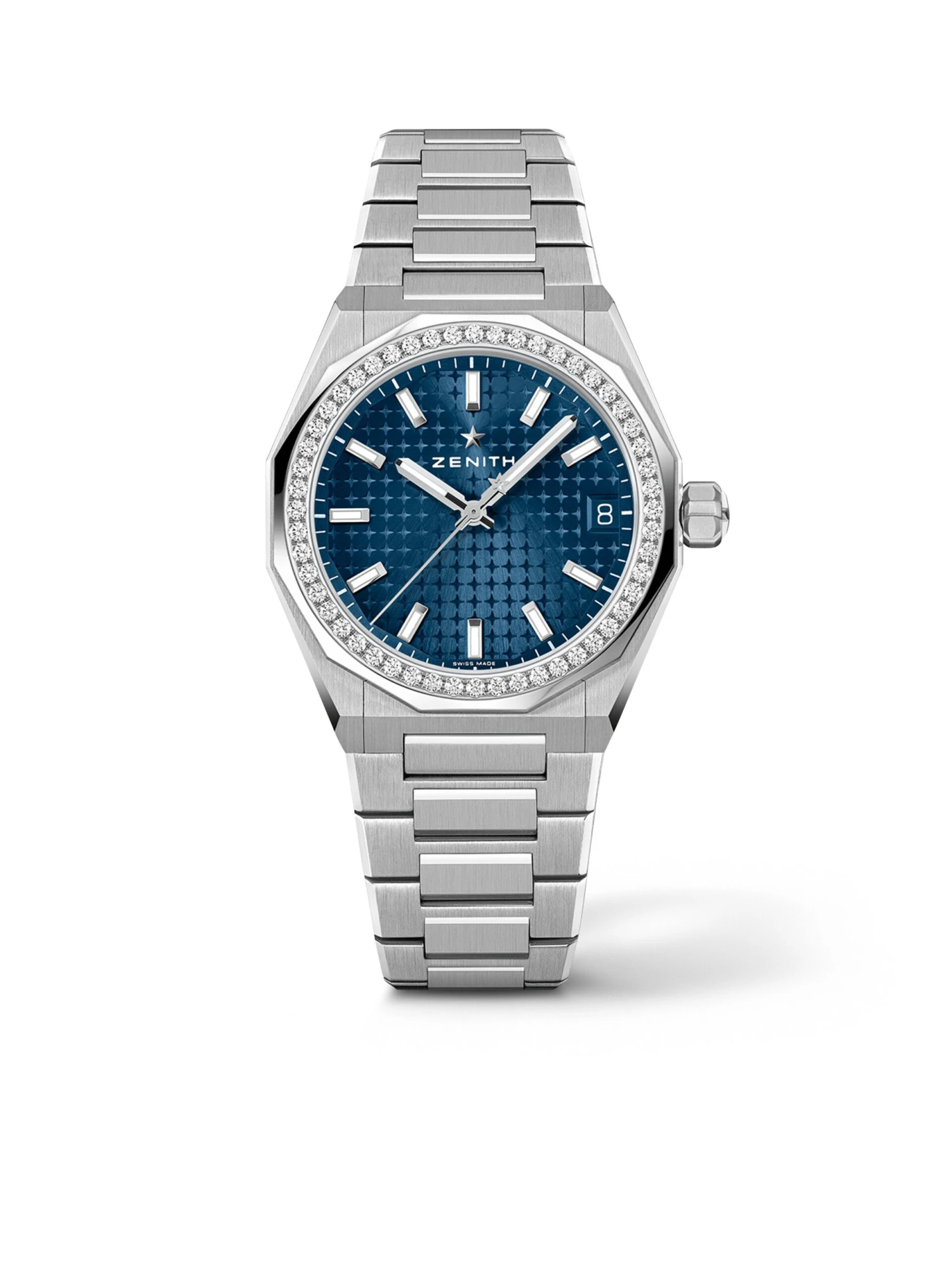 With its 36-millimeter stainless steel case and diamond-studded faceted bezel, the feminine Zenith Defy Skyline 36 (Ref. 16.9400.670/51.I001) is a testament to particular elegance. The blue sunburst dial has an interesting depth thanks to its four-pointed star pattern and refers to the model’s design origins in the 1960s through the use of the former Zenith logo. Inside the case, there is self-winding manufacture caliber ELITE 670 with a power reserve of up to 50 hours. This ladies’ model, which is water-resistant to 100 meters and has a date display at three o’clock, is fitted on a classic stainless-steel bracelet, that thanks to a quick-change system, can easily be replaced by the additional rubber strap with a blue pattern