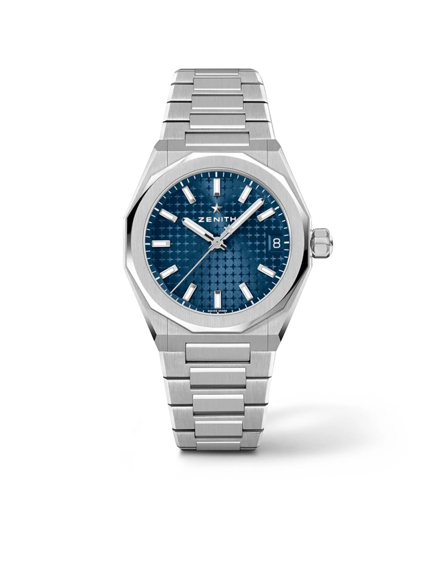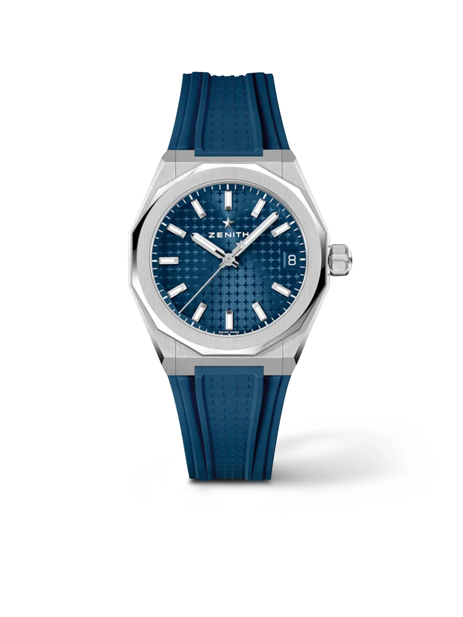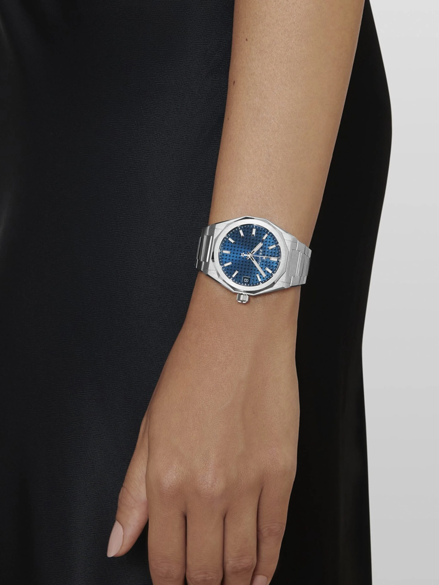 Great design with a smaller diameter. With a size of just 36 millimeters, the Defy Skyline (Ref. 03.9400.670/51.I001) fits perfectly on more slender wrists. The 12-sided bezel, the characteristic four-pointed star pattern, and the date display at three o’clock are retained in this stainless-steel version with a blue dial. It is powered by self-winding caliber ELITE 670 with an impressive power reserve of up to 50 hours. This timepiece, which is water-resistant to 100 meters, is fitted on a classic stainless-steel bracelet that, thanks to a quick-change system, can easily be replaced by the additional blue rubber strap.